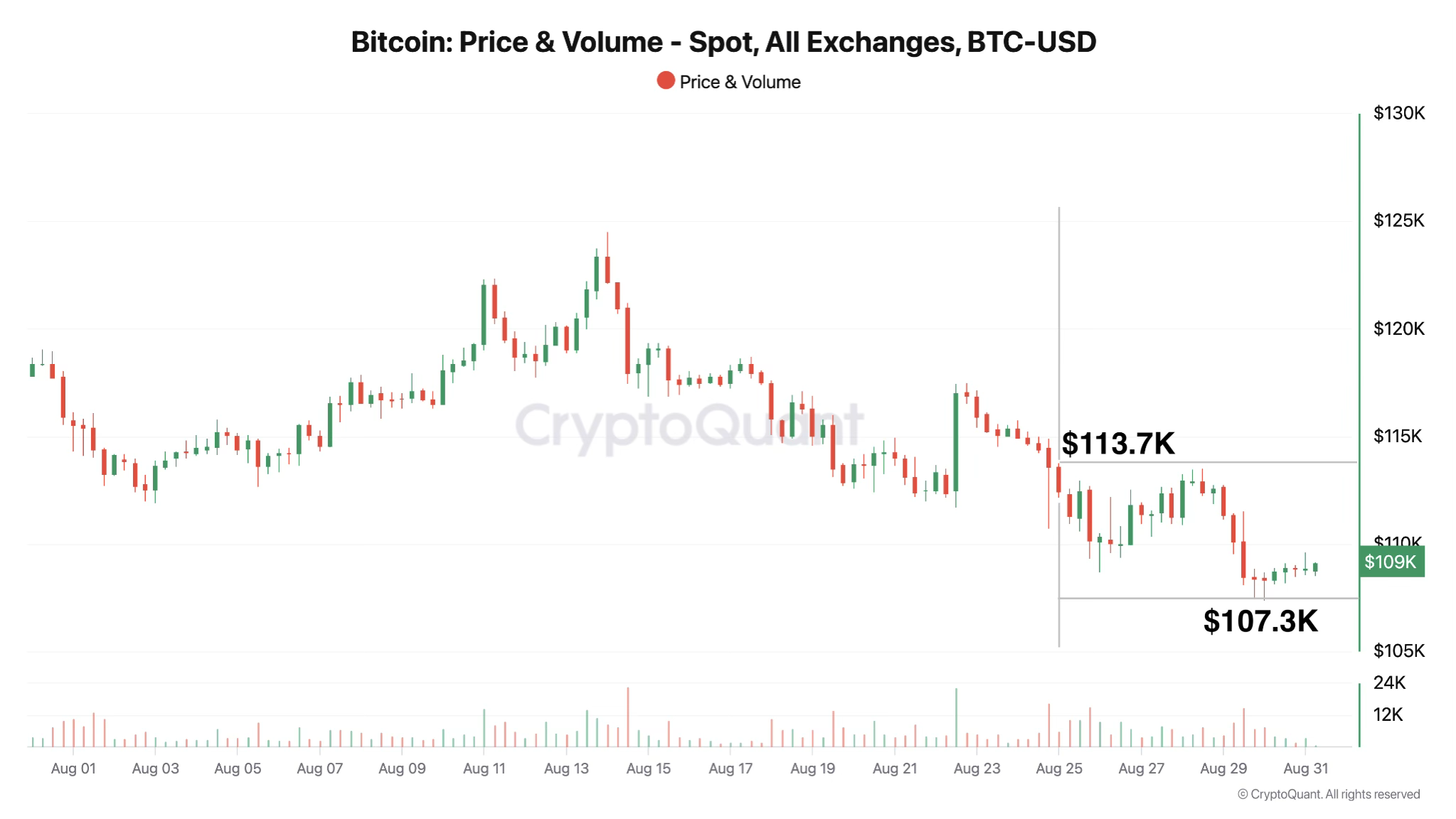 Падение до $107.3 тыс. сопровождалось всплеском продаж и быстрым поглощением.