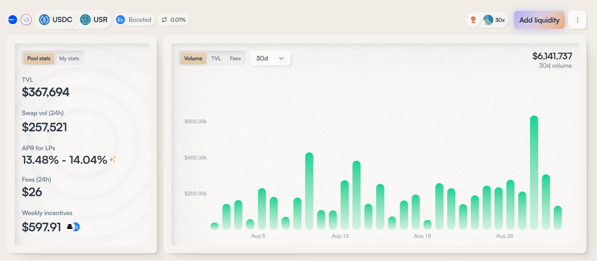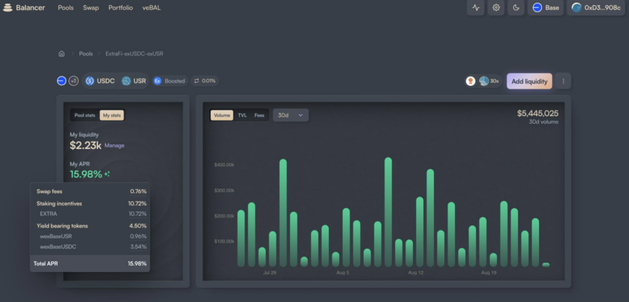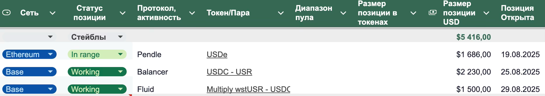 4. Открыта позиция Balancer Base USDC-USR, доходность на уровне 15-16% APR. Посмотрим как долго продержится такой уровень.