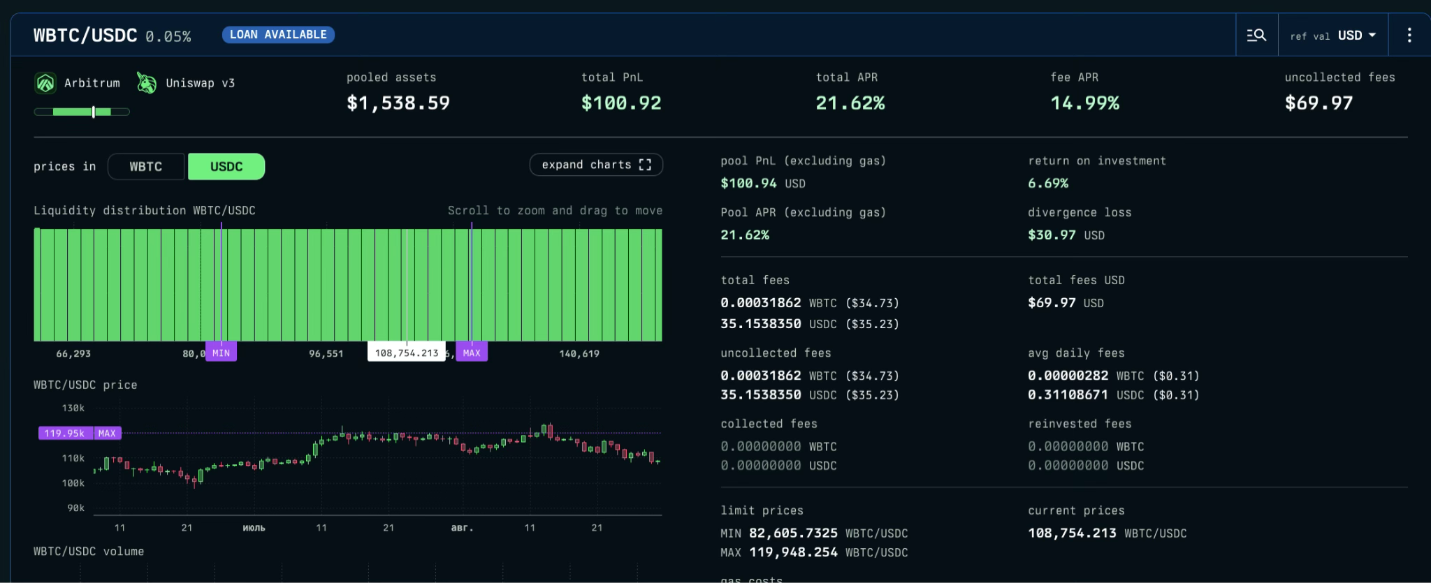 Позиция Uniswap V3 Arbitrum BTC-USDC 82 тыс. -120 тыс.