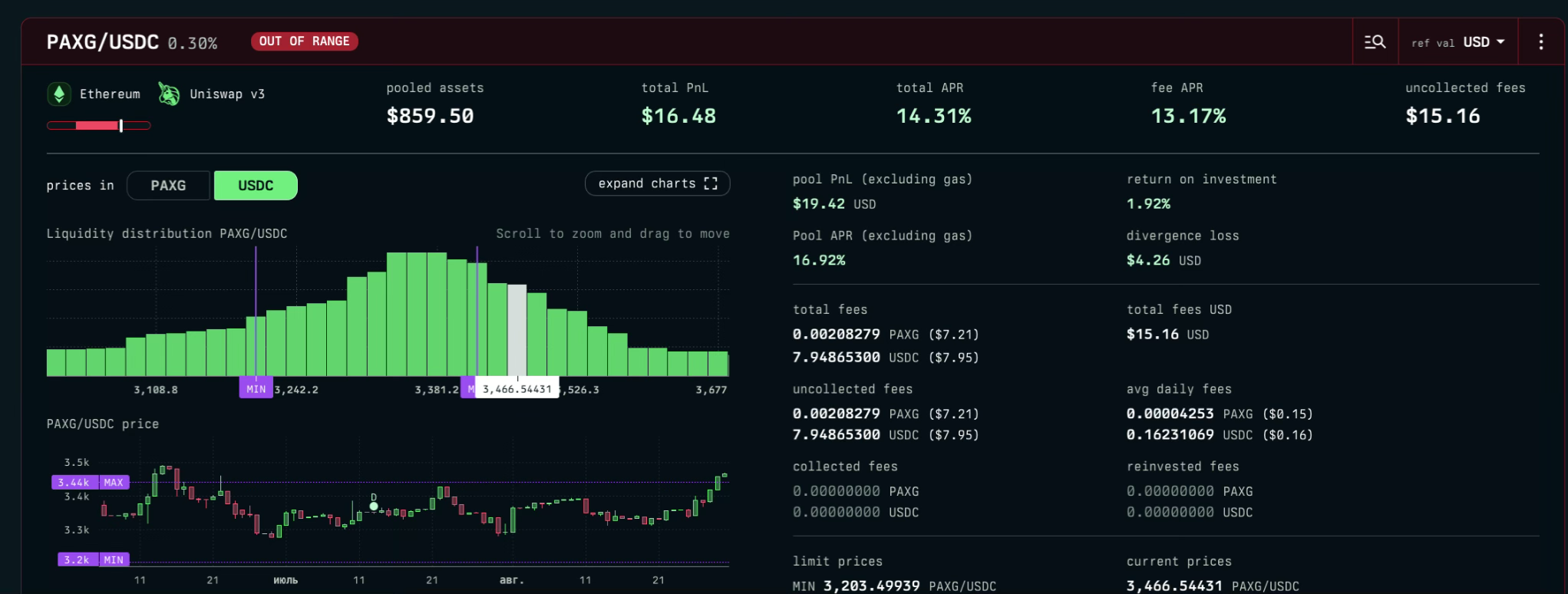 Позиция Uniswap V3 Ethereum PAXG - USDC 3200 - 3450