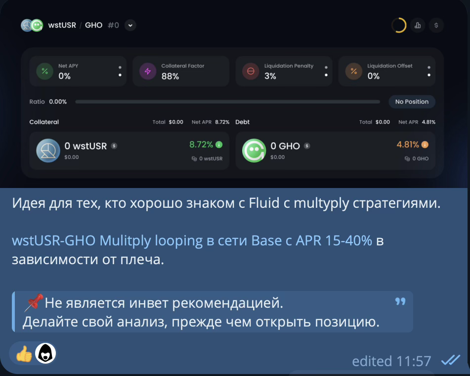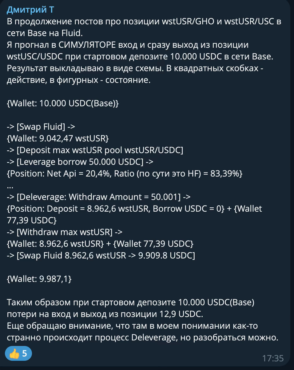 Открыта позиция в Fluid Multiply wstUSR-USDC, leverage 6x