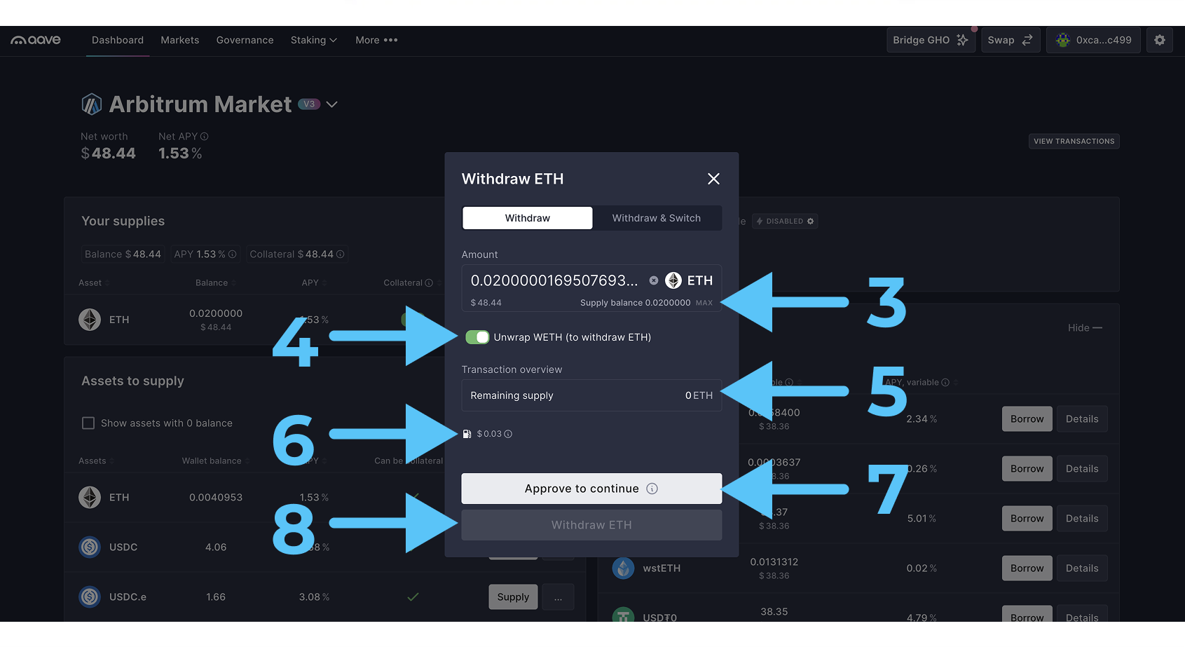 - Кликаем на “Approve to continue“ (7), затем на “Withdraw ETH“ (8)