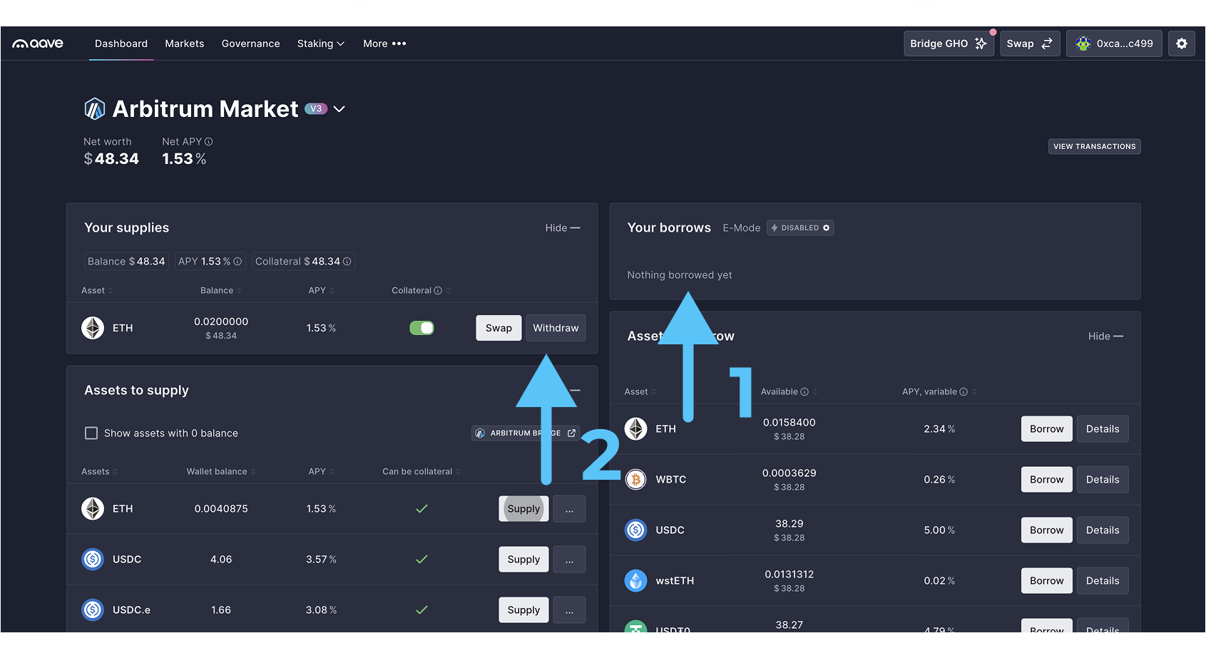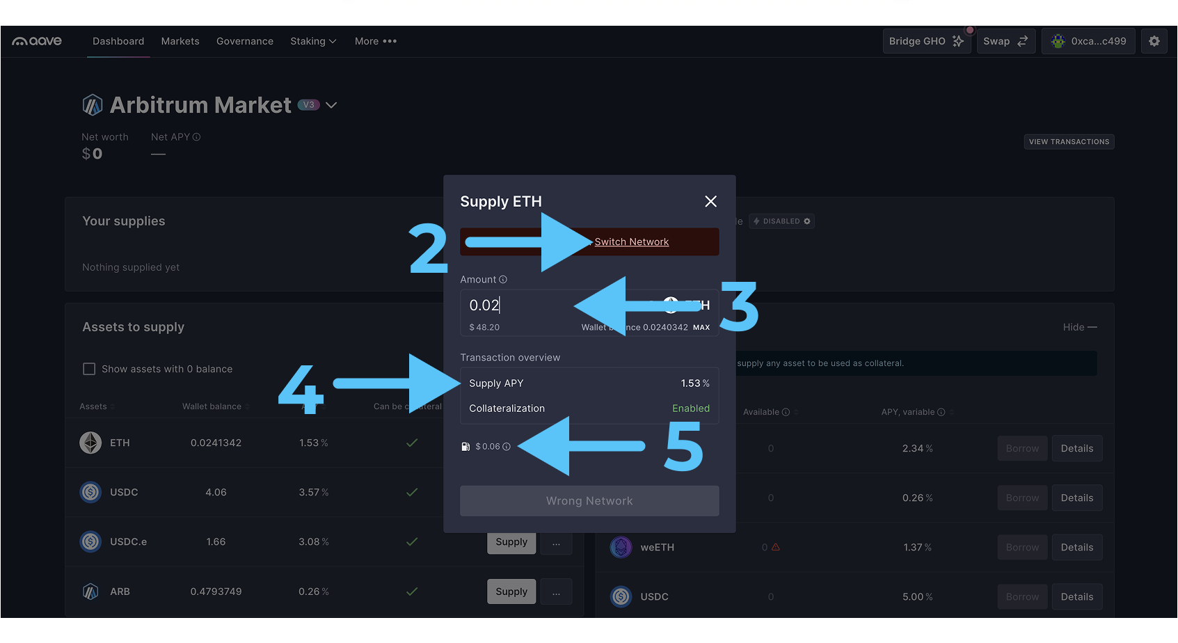 - Выбираем актив, который хотим добавить на платформу в качестве залога “Supply“ (1). В нашем случае это ETH