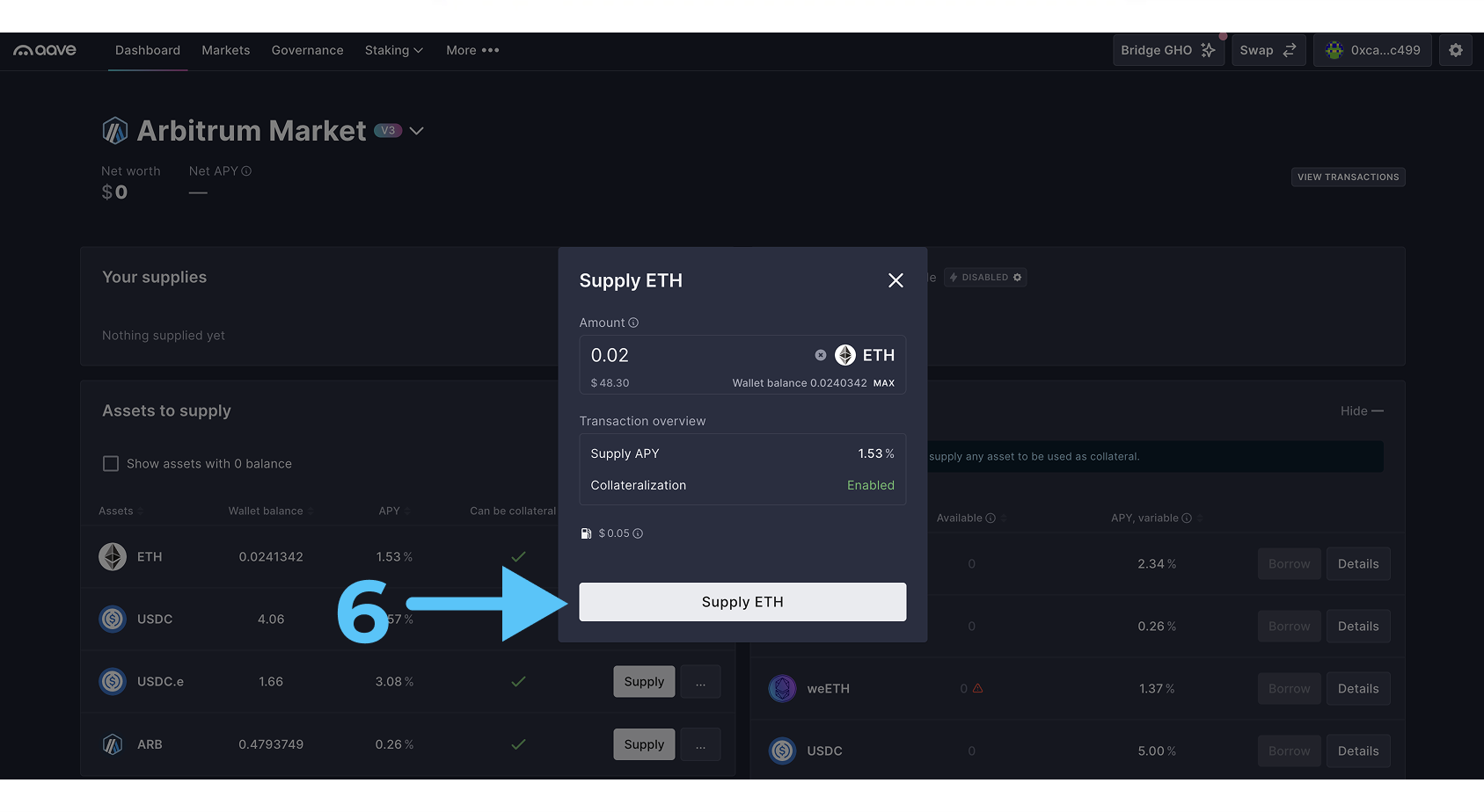 - Перепроверяем всё ещё раз и кликаем на “Supply ETH“ (6) и подписываем транзакции