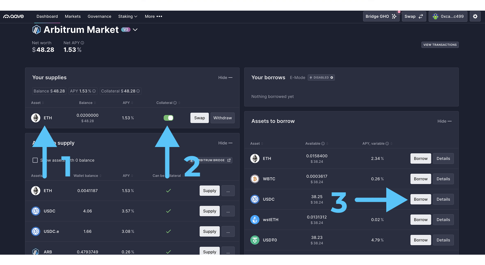 - Видим, что наш залог теперь отображается на платформе (1) и ползунок горит зелёным (2). Это означает, что мы можем взять займ. Кликаем на “Borrow“ (3). Вы можете выбрать любой актив из представленных, мы выбрали USDC