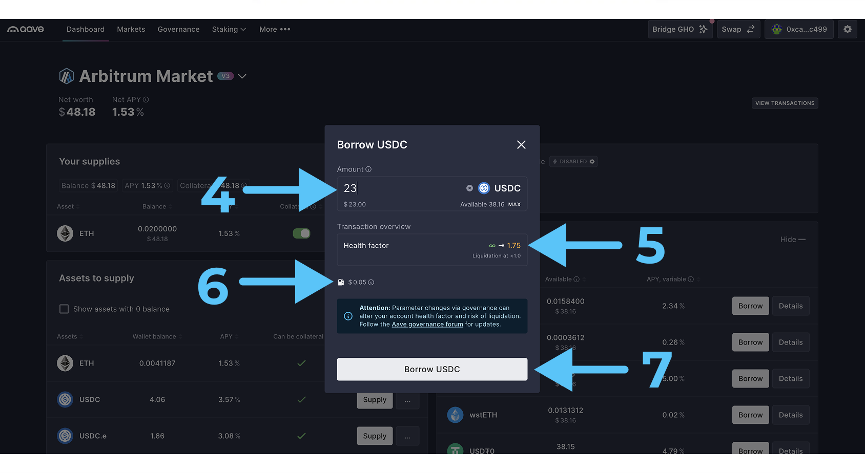 - Кликаем на “Borrow USDC” (7) и подписываем транзакции