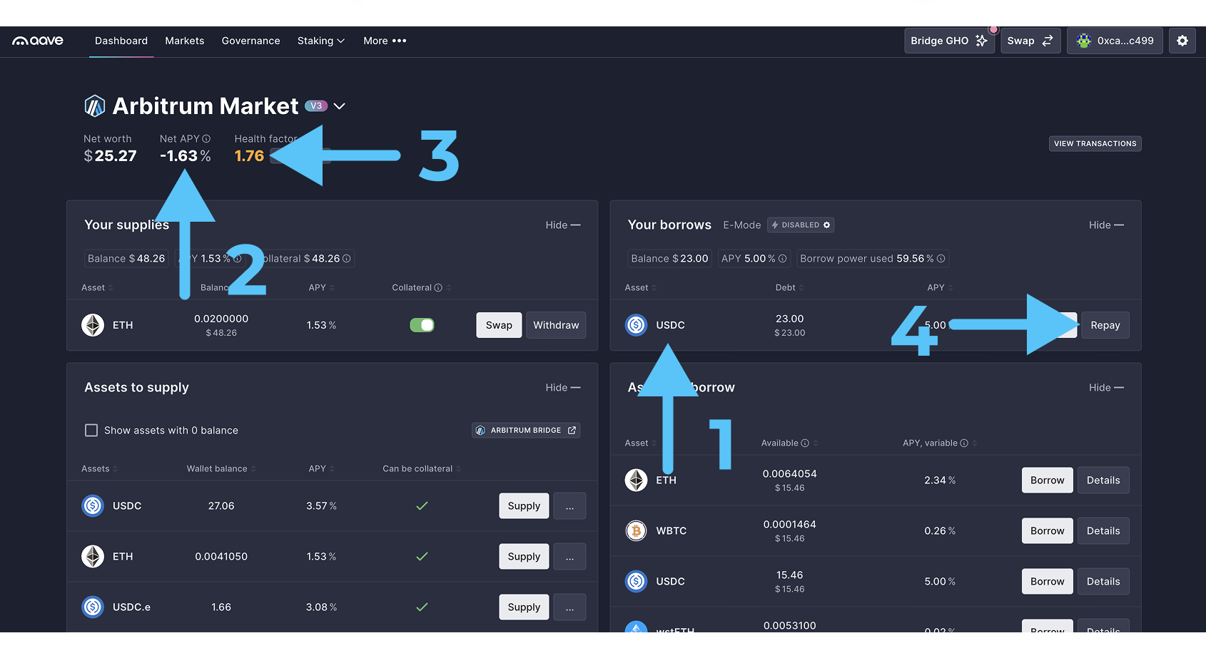 - Кликаем на “Repay“ (4) - возвращаем займ