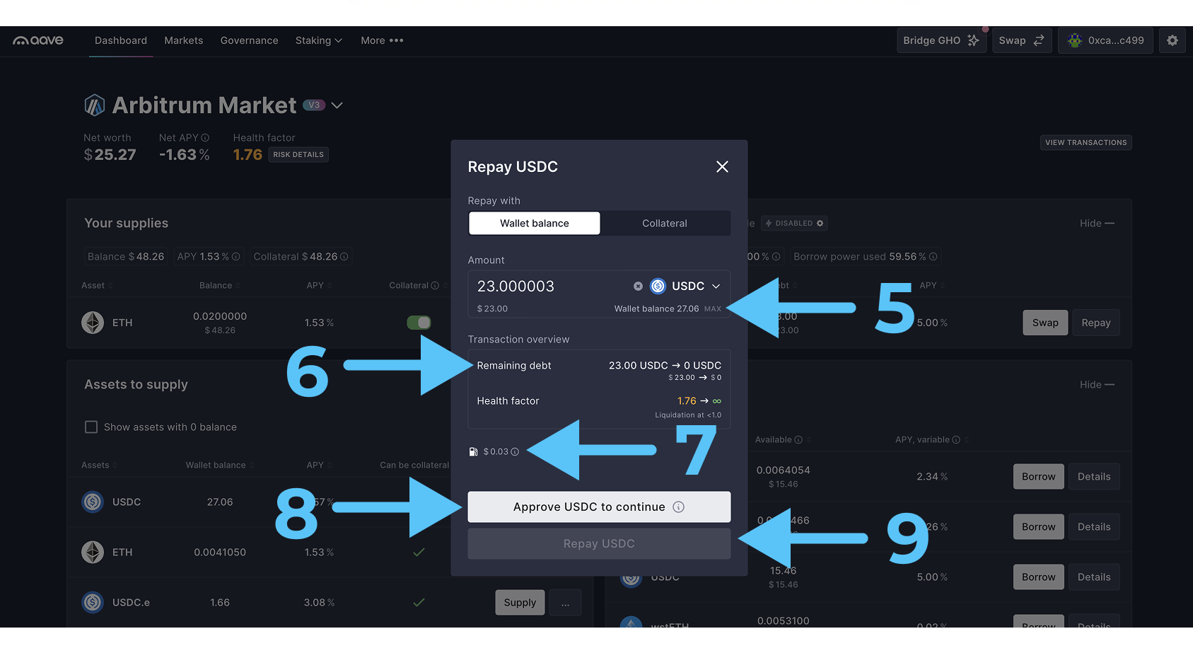 - Кликаем на “Approve USDC to continue“ (8), затем на “Repay USDC” (9)