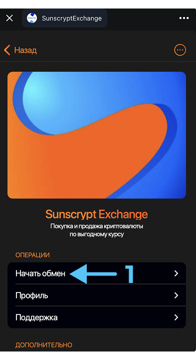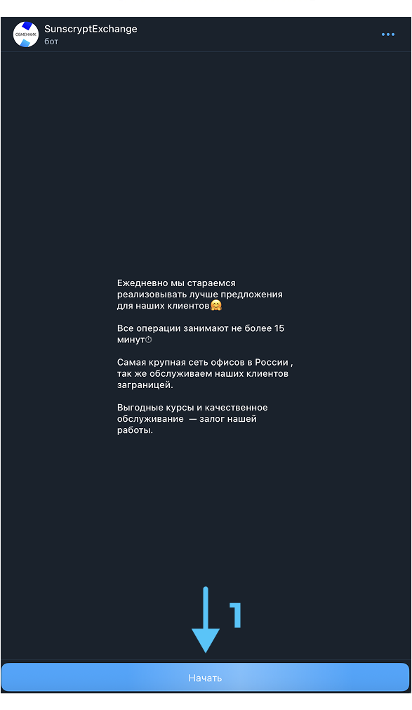 - Перейдите на официальную страницу обменника: https://t.me/SunscryptExchangeBot (скопируйте ссылку и вставьте её в поисковую строку браузера). Кликните на кнопку «Начать» (1), чтобы запустить бота.