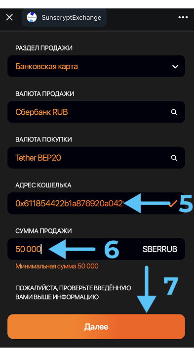 - Внесите необходимую сумму для покупки криптовалюты (6). Учтите возможные ограничения по минимальным суммам, указанные системой. Проверьте все внесённые данные на точность и кликайте на кнопку «Далее» (7).