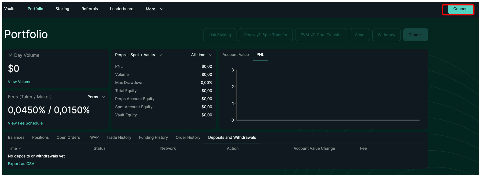 Переходим на Perp DEX Hyperliquid в раздел Portfolio, подключаем кошелек Rabby Wallet