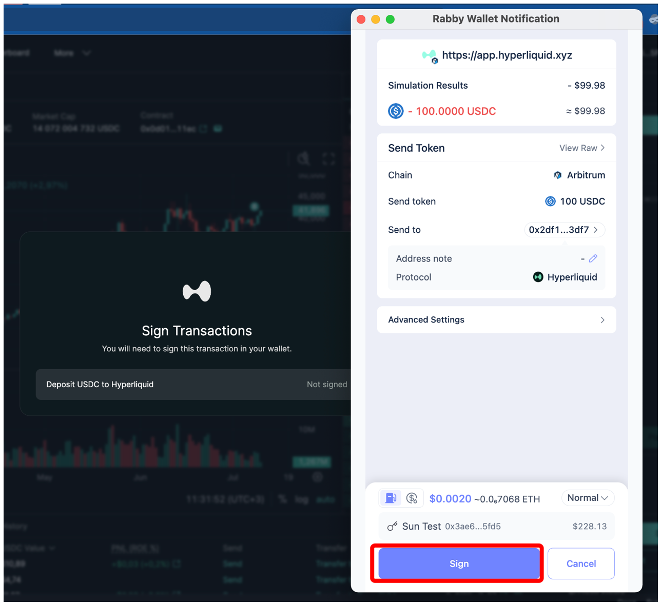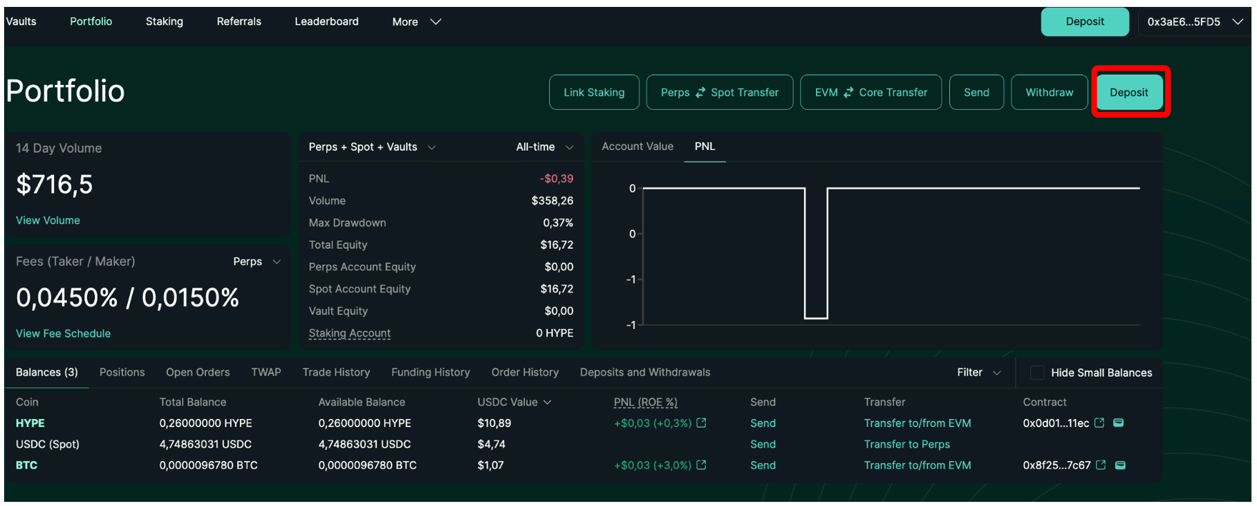 Кнопка Deposit - предназначена для пополнения баланса на Hyperliquid