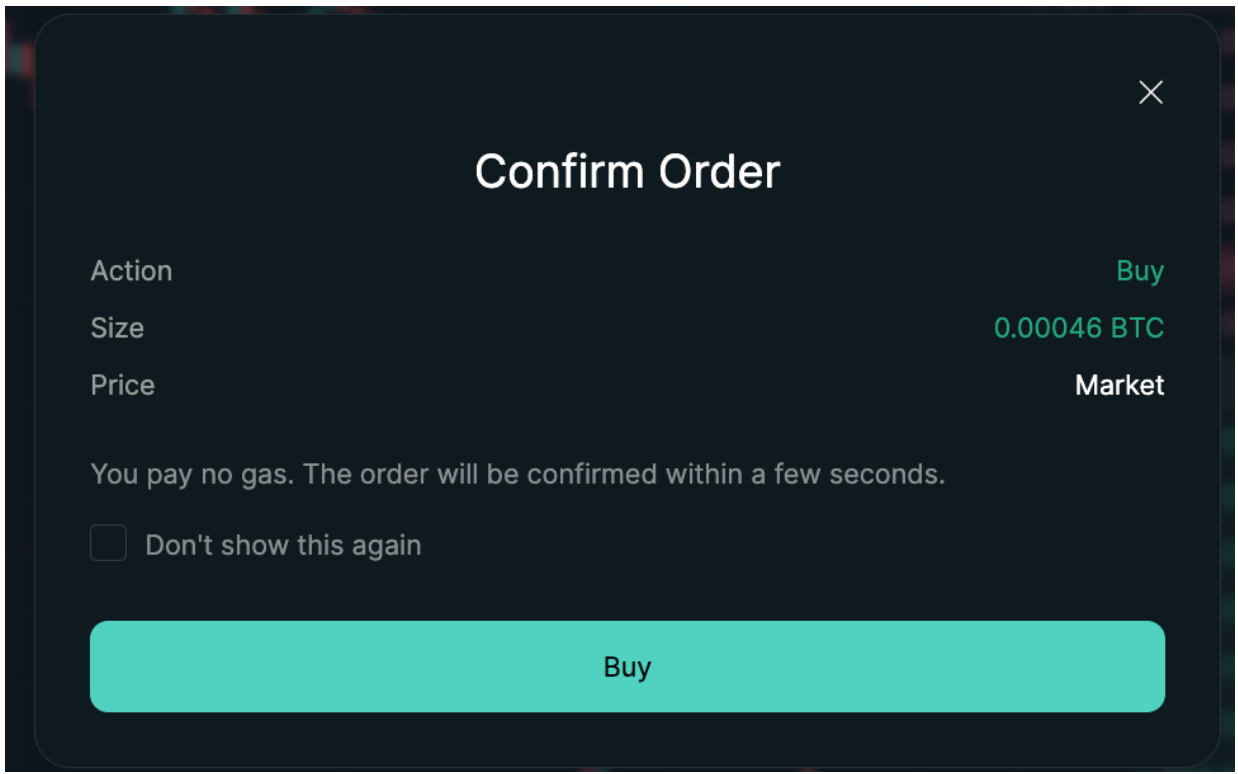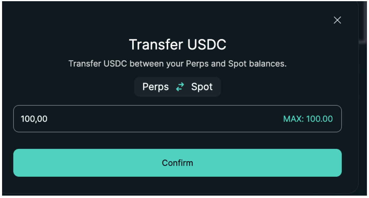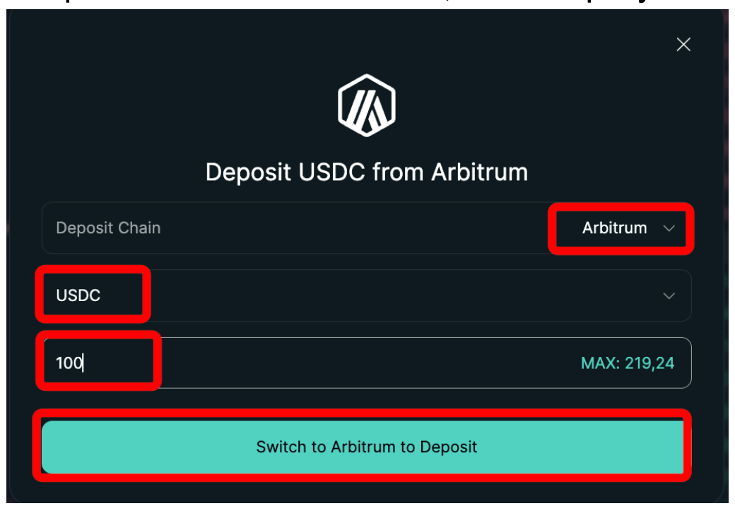 Соглашаемся с комиссией биржи $1. На балансе должны быть свободные USDC в режиме Perps.