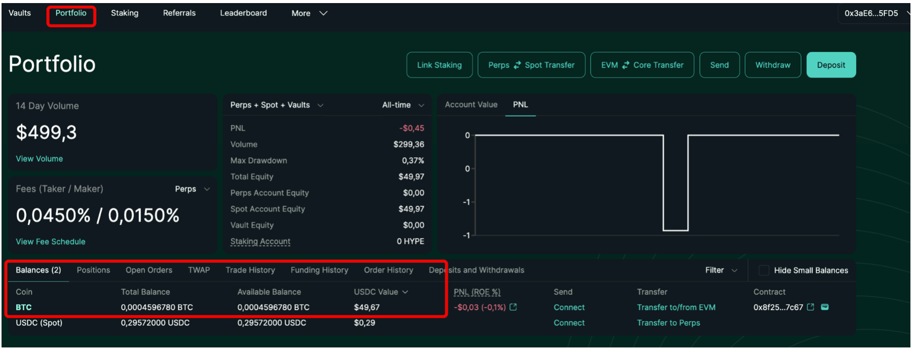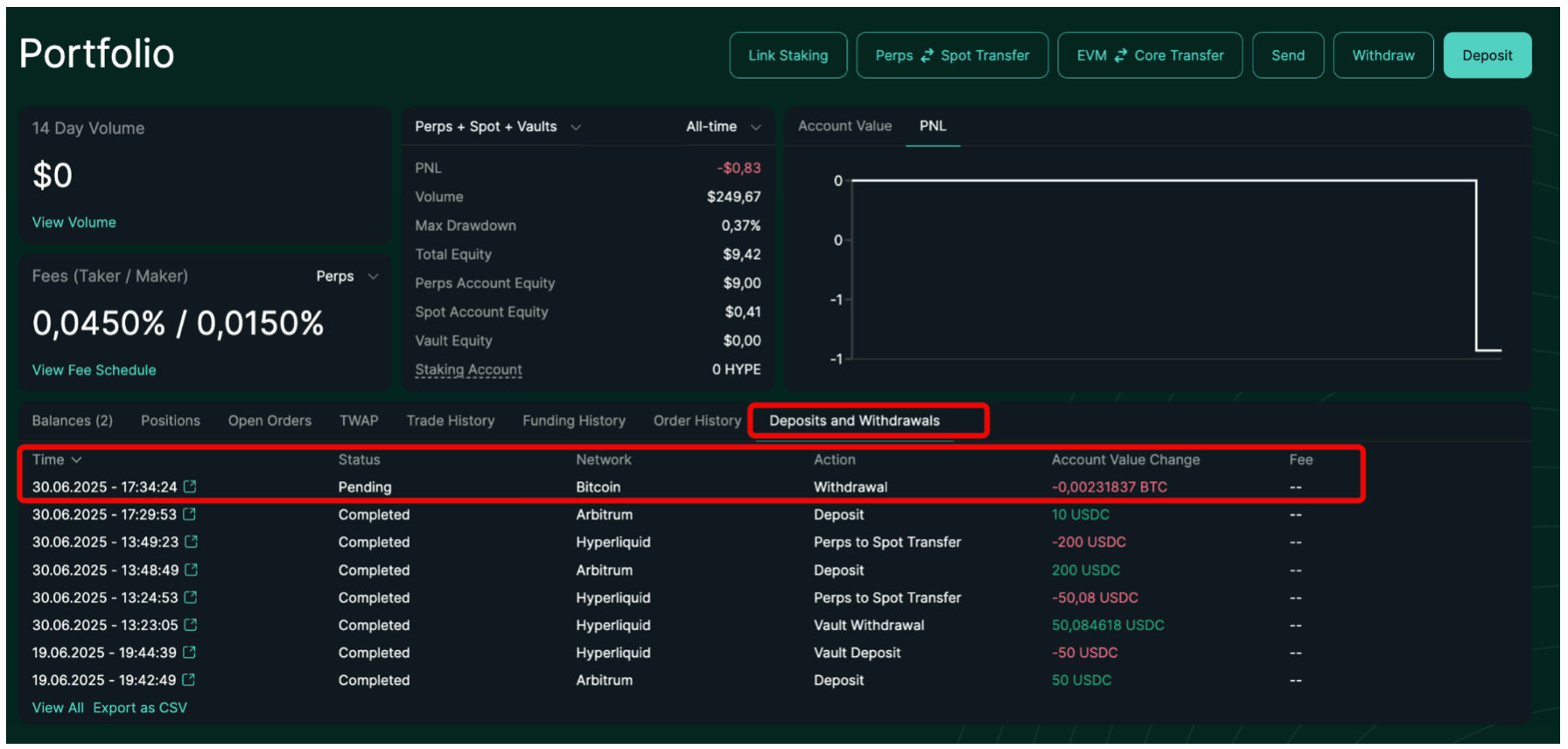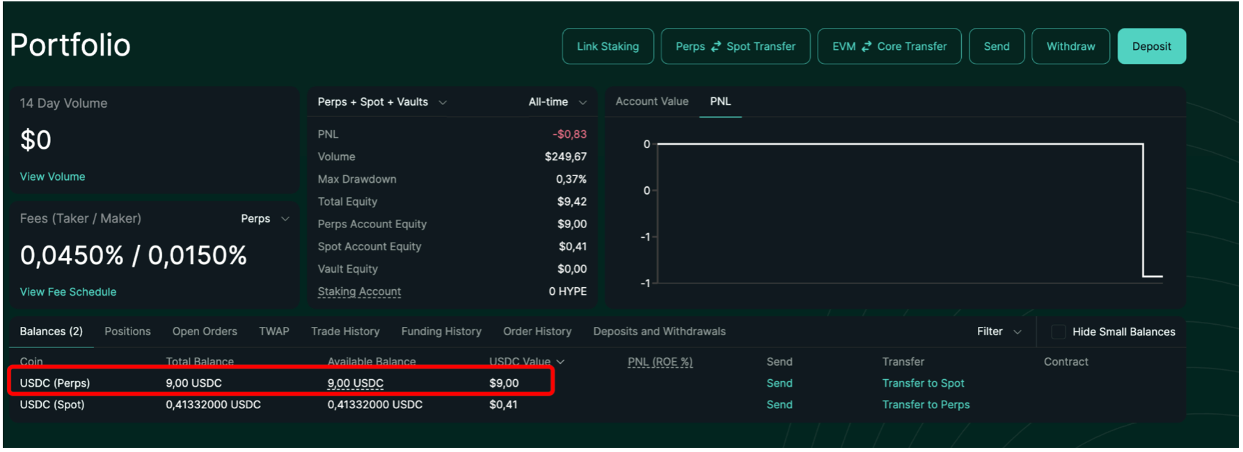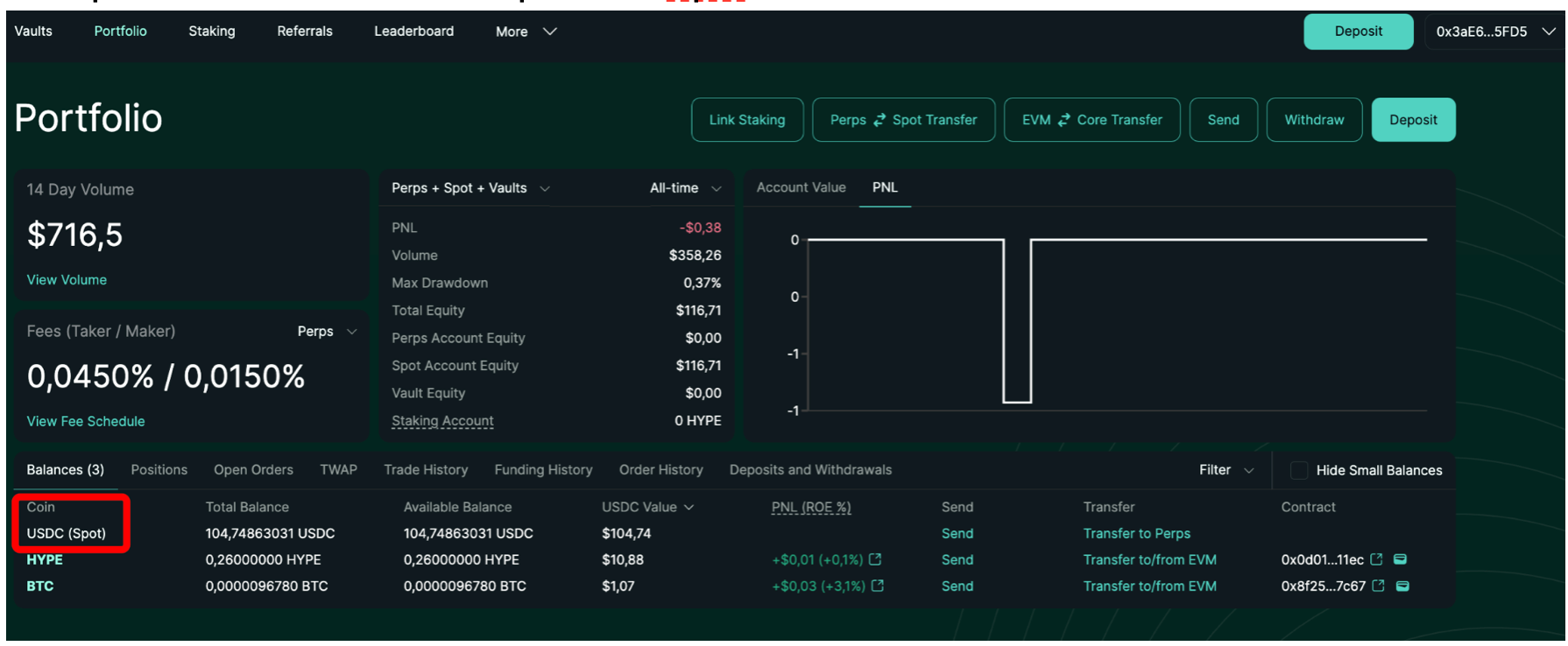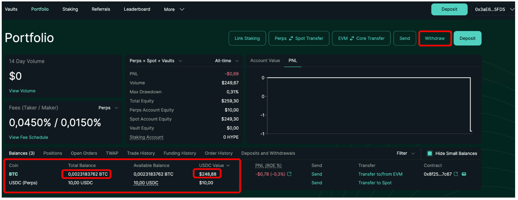 Важно ! Биткоинов должно быть больше 0,002 BTC и на балансе USDC Perps несколько долларов для оплаты комиссии $1.
