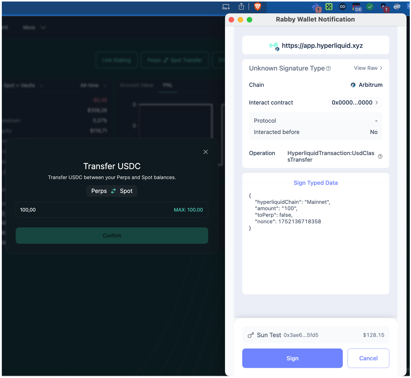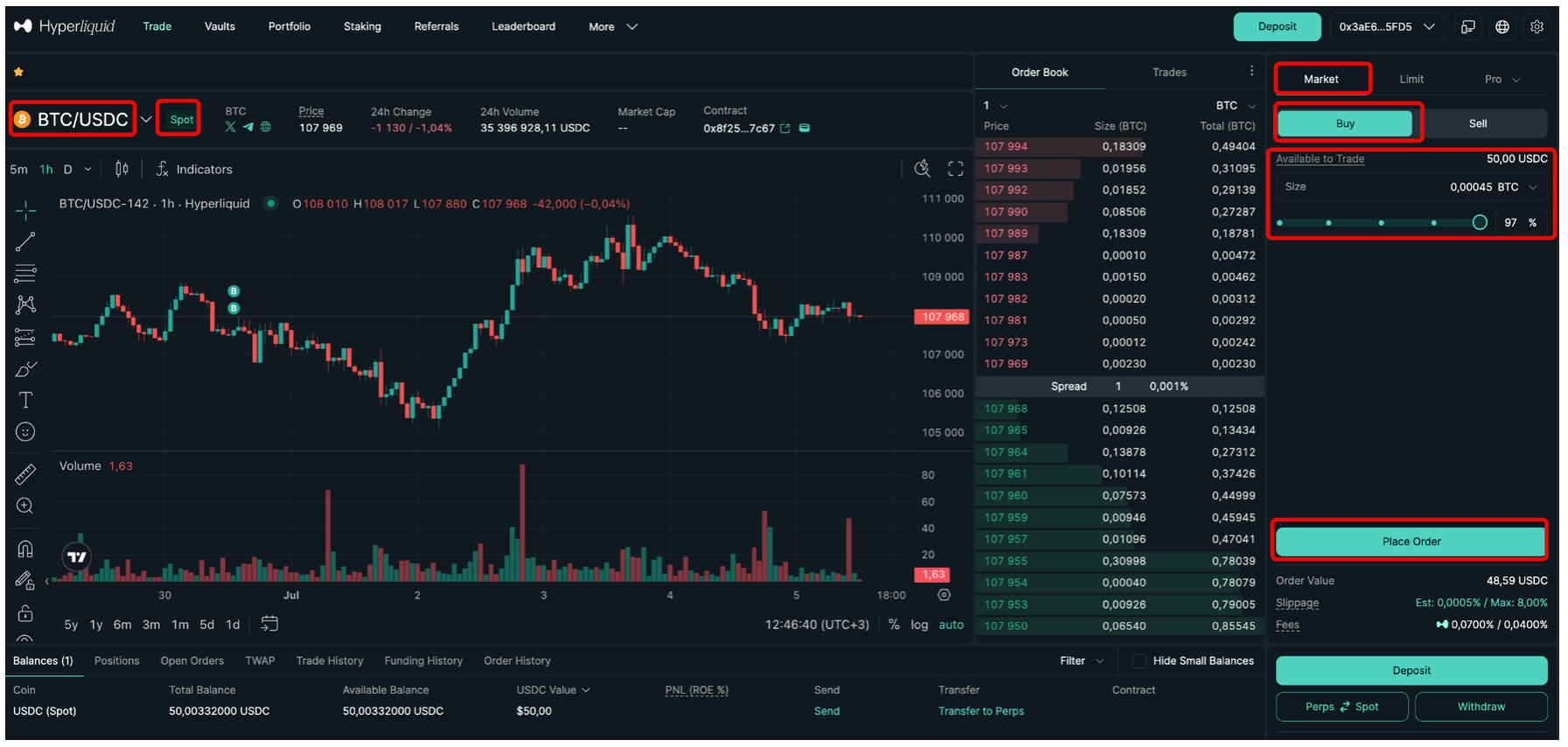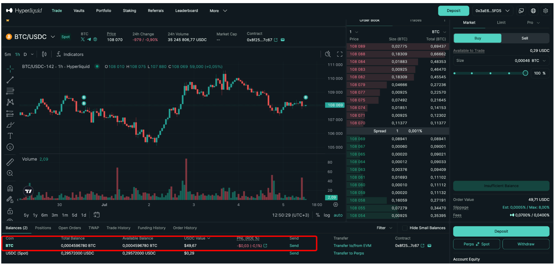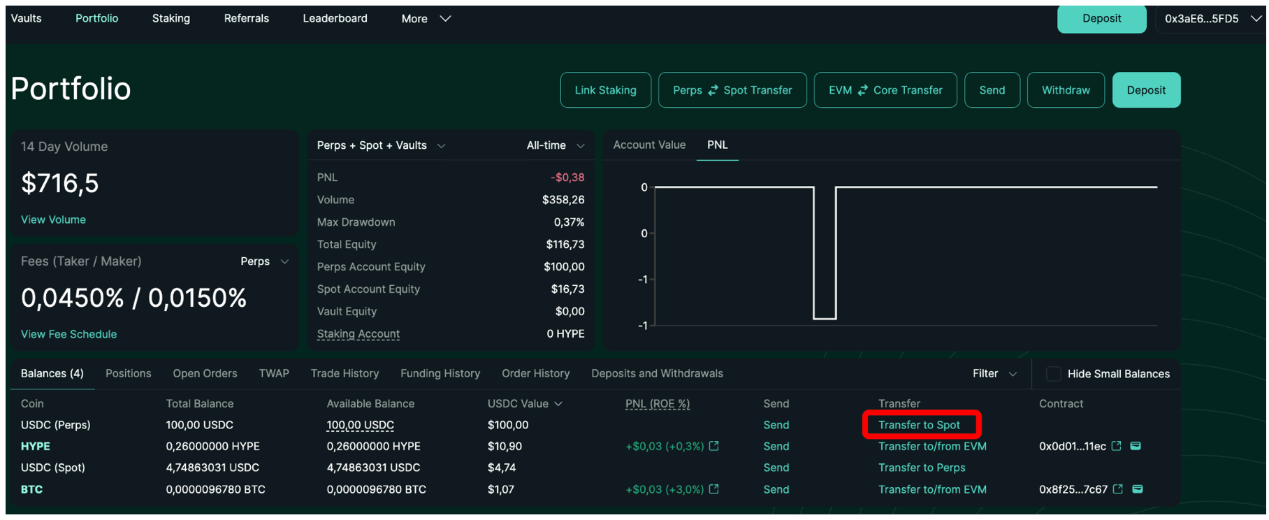 Важно ! Биткоинов должно быть больше 0,002 BTC и на балансе USDC Perps несколько долларов для оплаты комиссии $1.