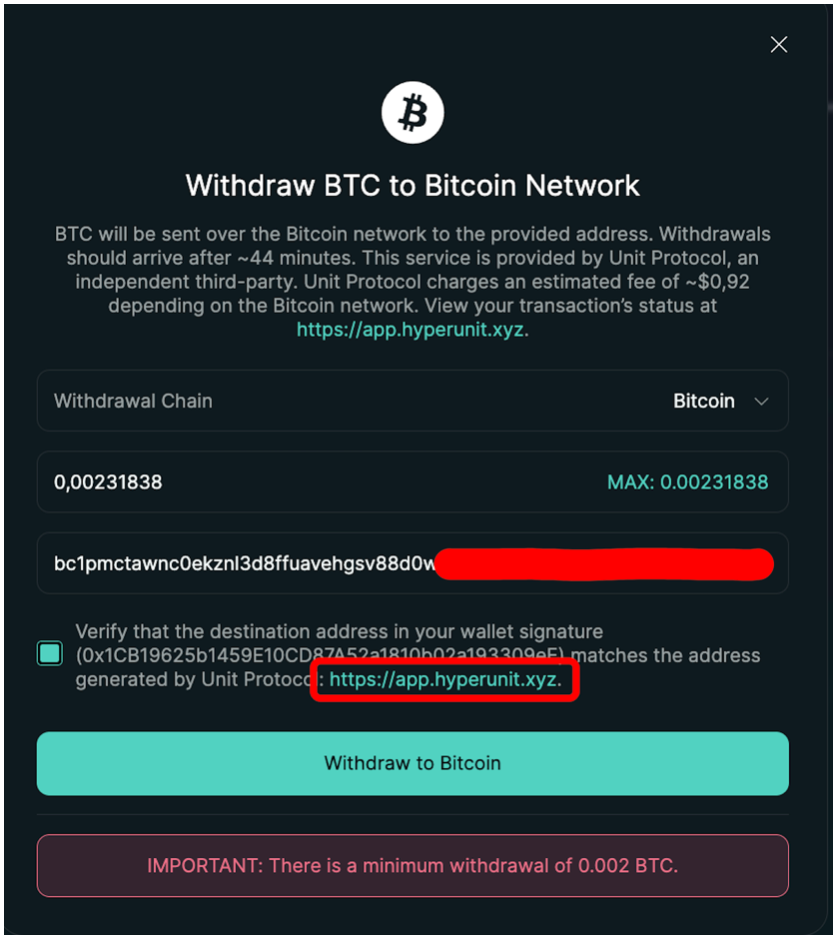 Важно ! Для последующего вывода BTC на свой кошелек в нативной сети - минимальная количество BTC 0,002.