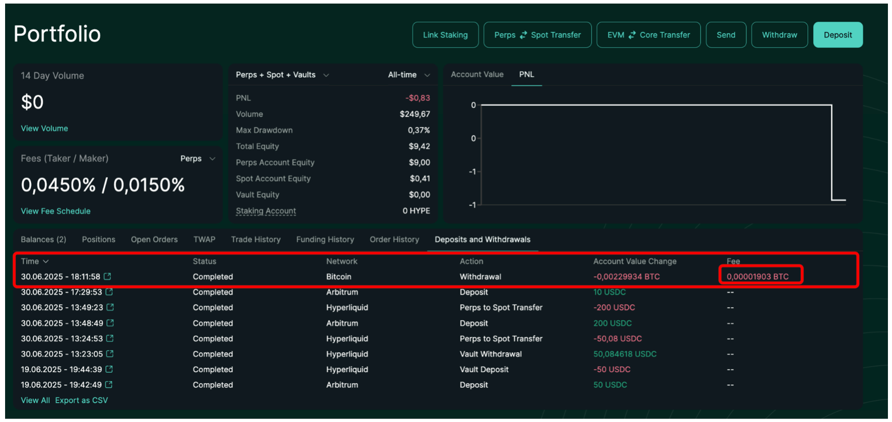 Комиссия сети BTC всего 4$. То есть общие затрат на пересылку BTC из Hyperliquid в кошелек 5$.