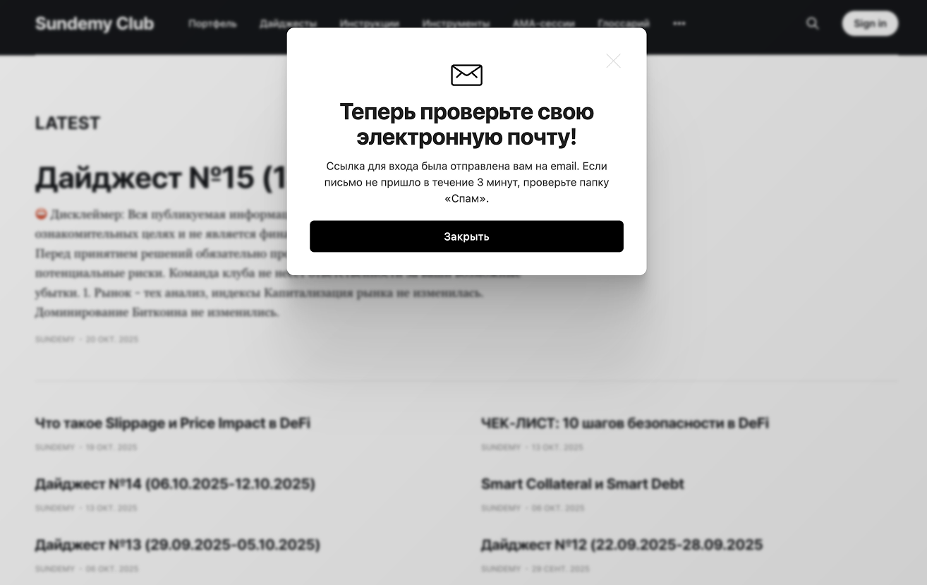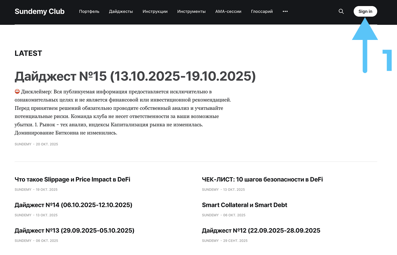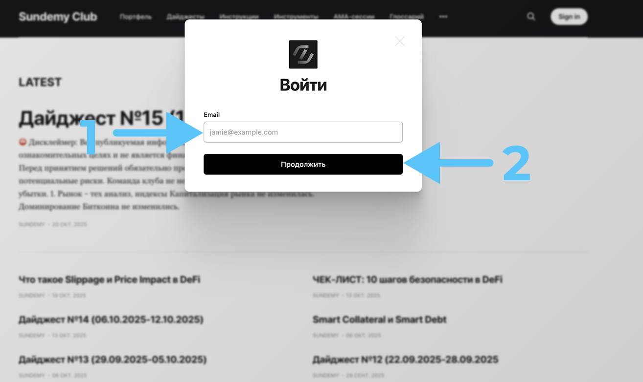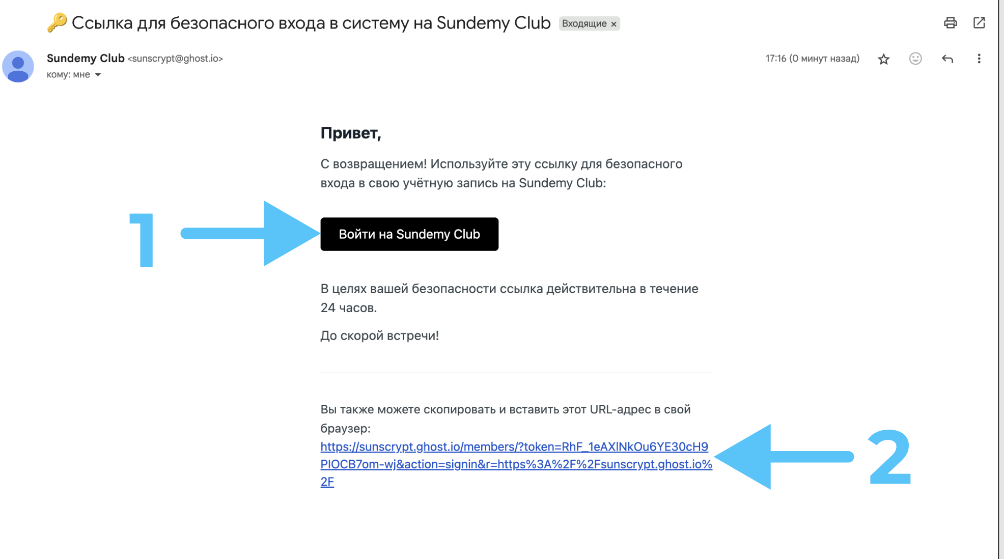 Когда письмо пришло - кликаем на "Войти на Sundemy Club" (1) либо копируем и вставляем URL-адрес в браузер (2). Доступ к статьям на платформе Ghost.io должен появиться. Важно! Ссылка действительна в течение 24 часов.