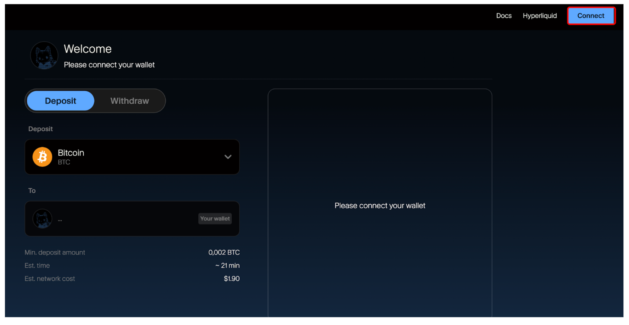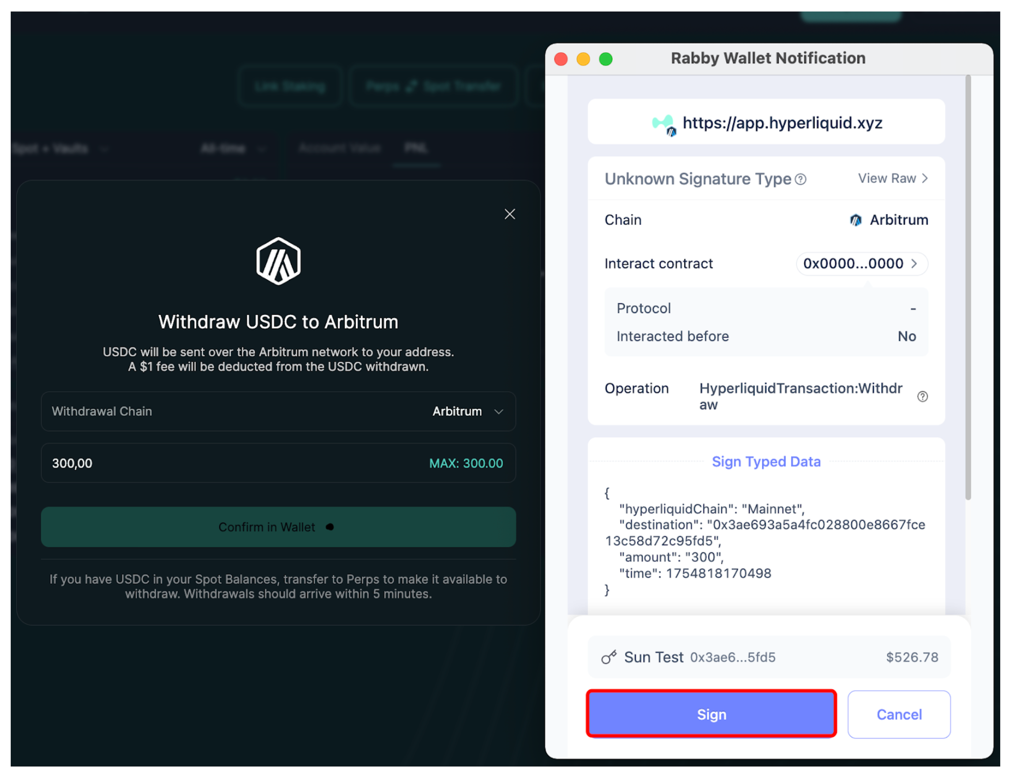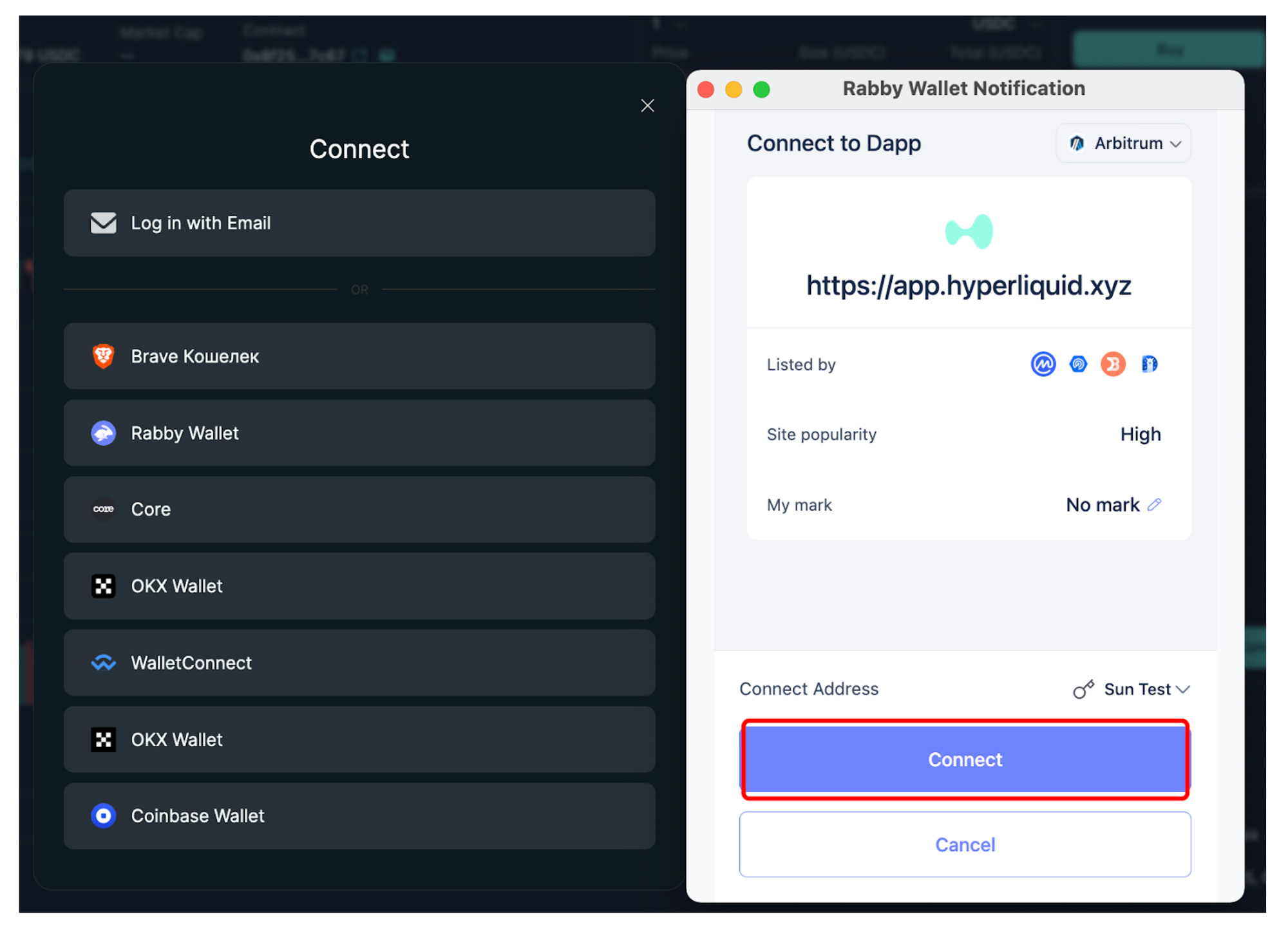 - Подключаем кошелек, в нашем примере Rabby Wallet. Нам нужно подключить адрес, который мы использовали для покупки BTC на бирже Hyperliquid. Мост подключается к нашему балансу на бирже Hyperliquid. Подписываем транзакцию.