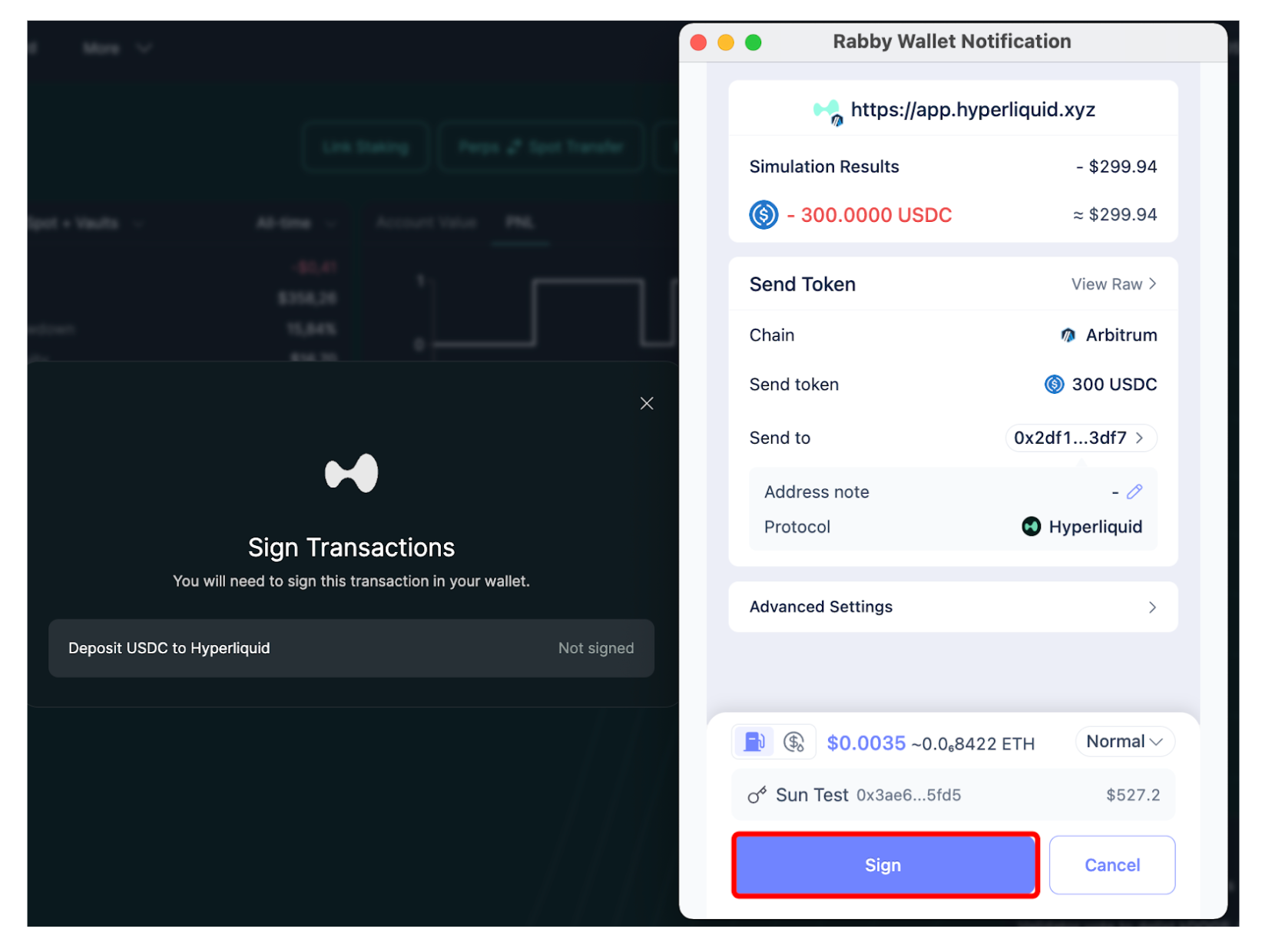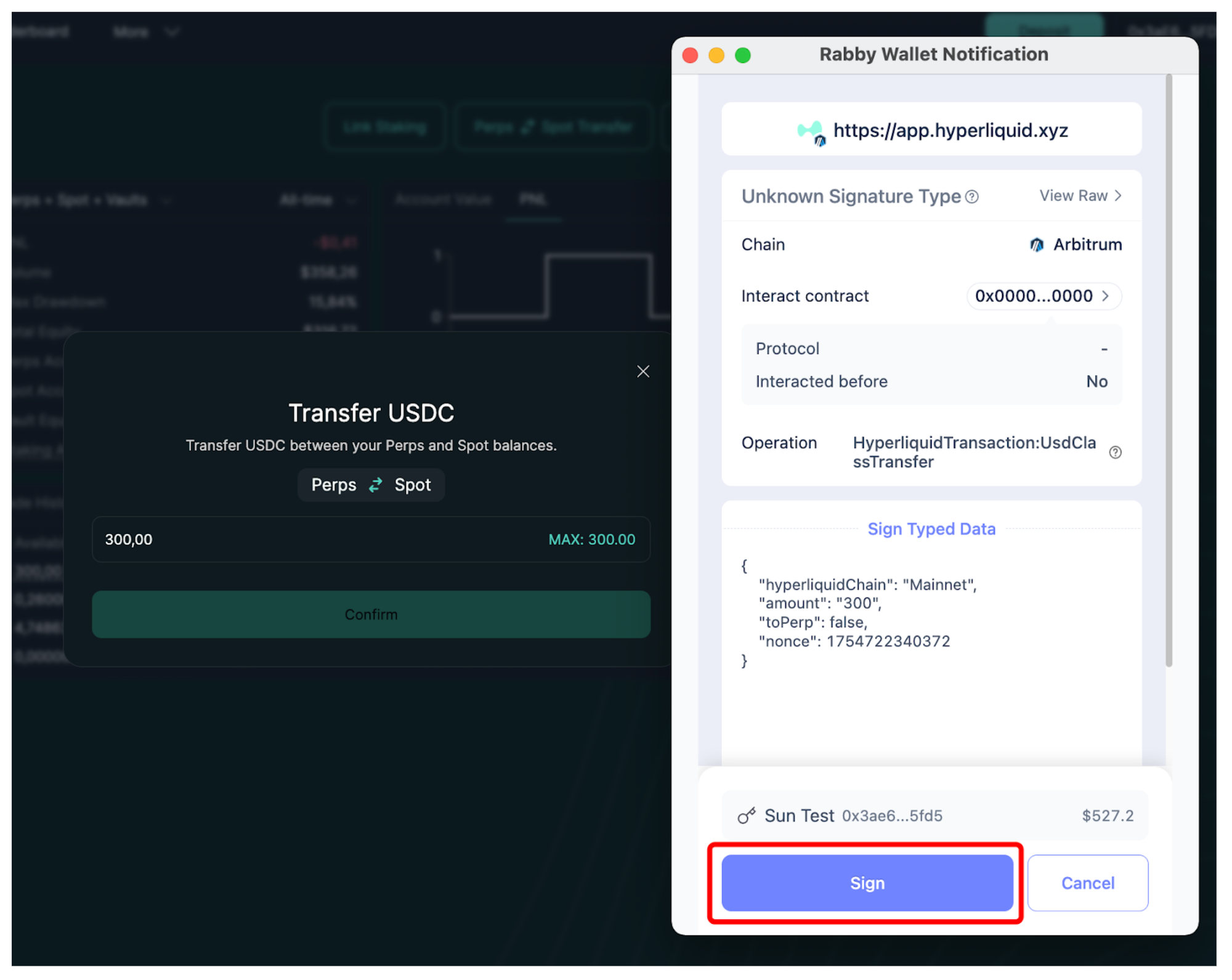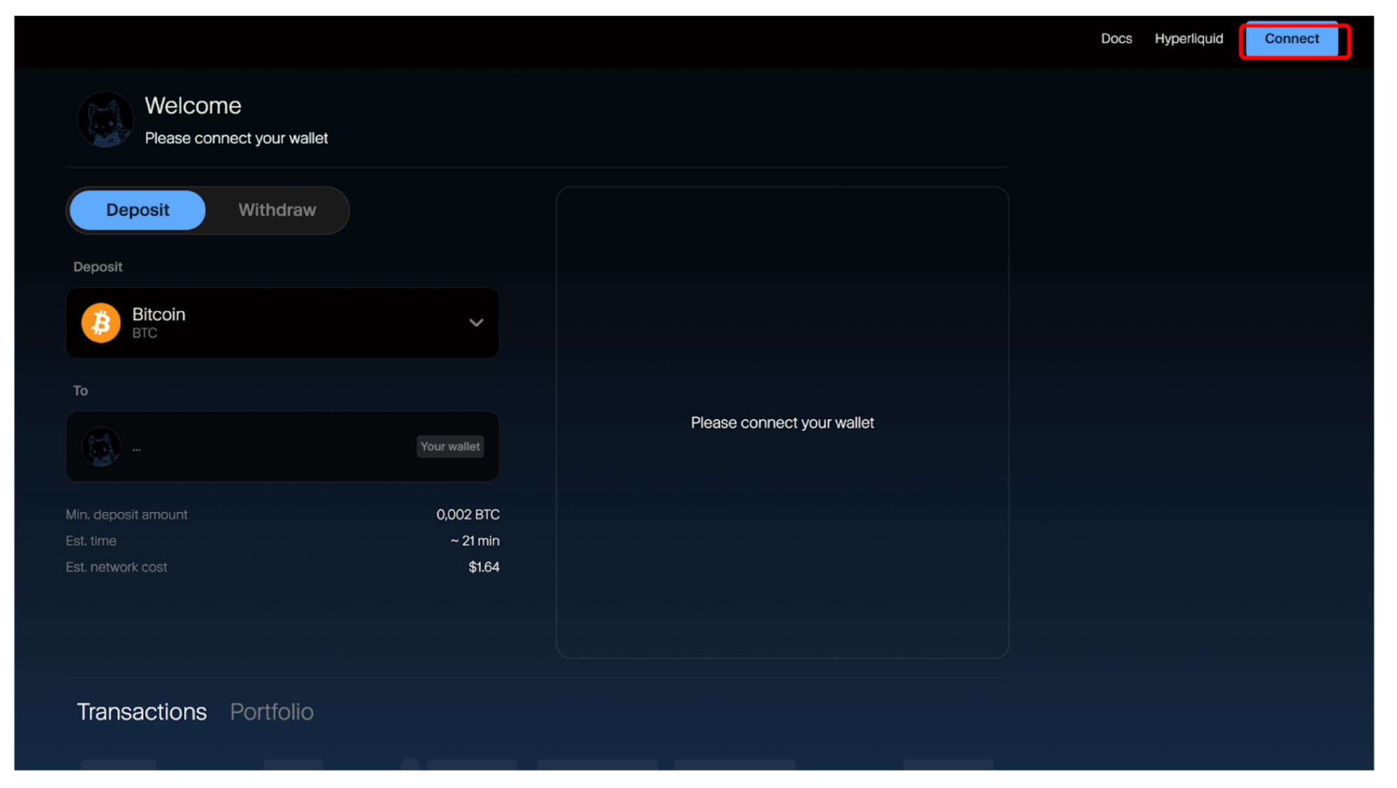 - Подключаем кошелек, в нашем примере Rabby Wallet. Нам нужно подключить адрес, который мы использовали для покупки BTC на бирже Hyperliquid. Мост подключается к нашему балансу на бирже Hyperliquid. Подписываем транзакцию.