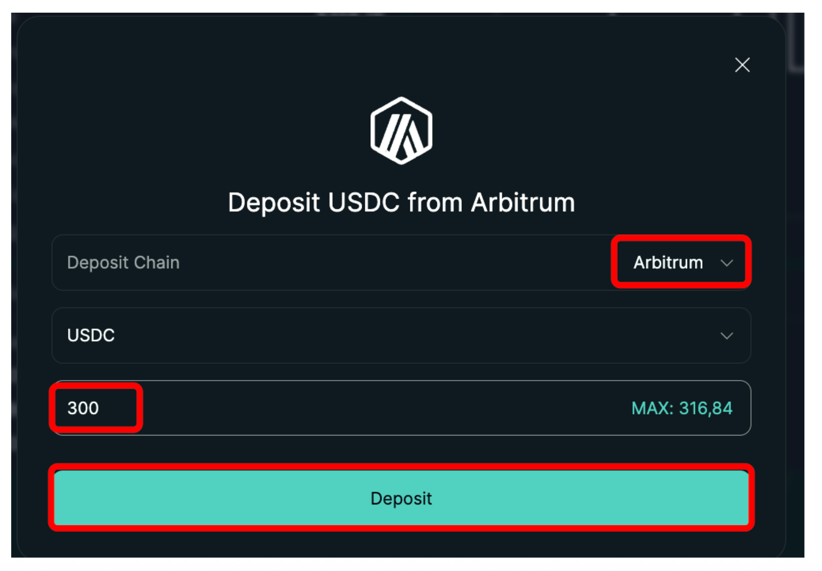 - Переходим на вкладку Portfolio чтобы пополнить свой баланс USDC в сети Arbitrum. Нажимаем кнопку Deposit. Указываем необходимое количество USDC. Нажимаем кнопку Deposit.