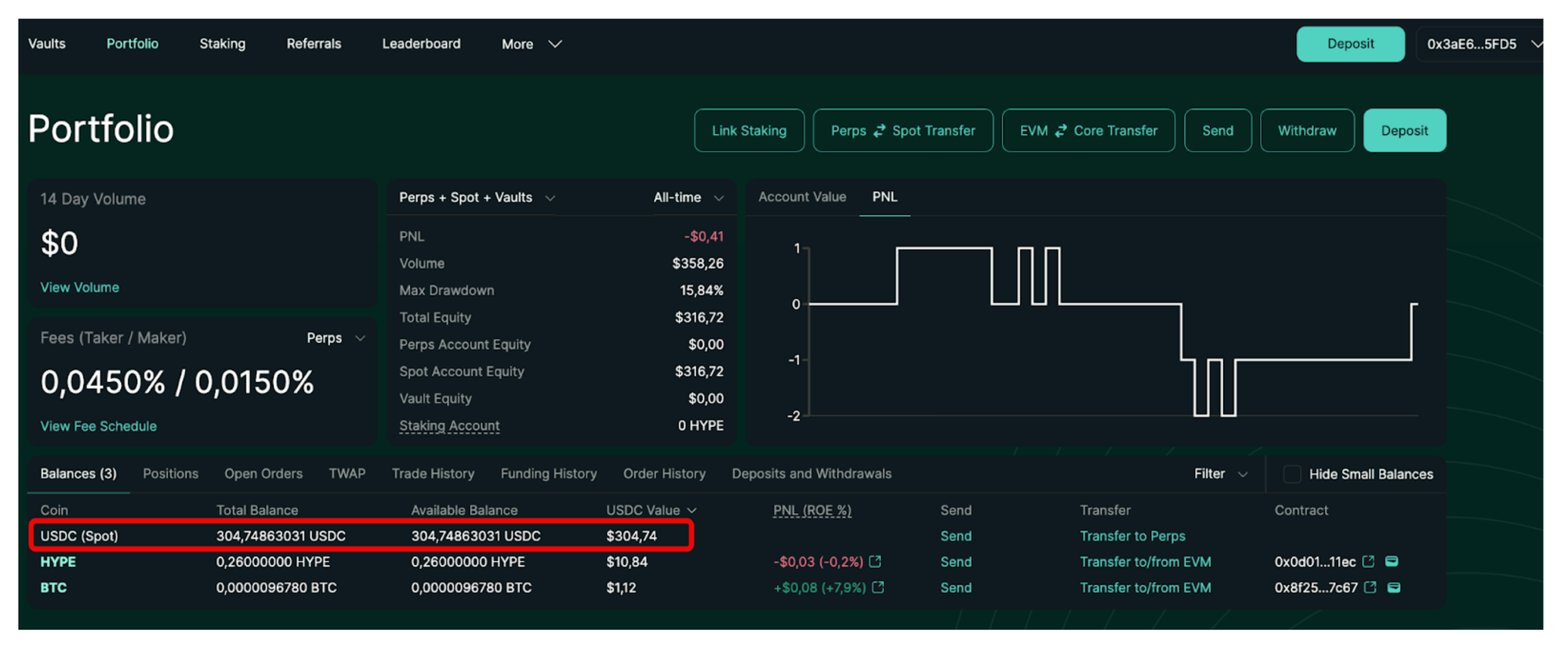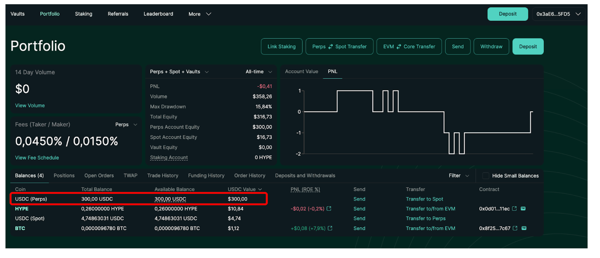 - Наш баланс в Hyperliquid отражается во вкладке Balances.