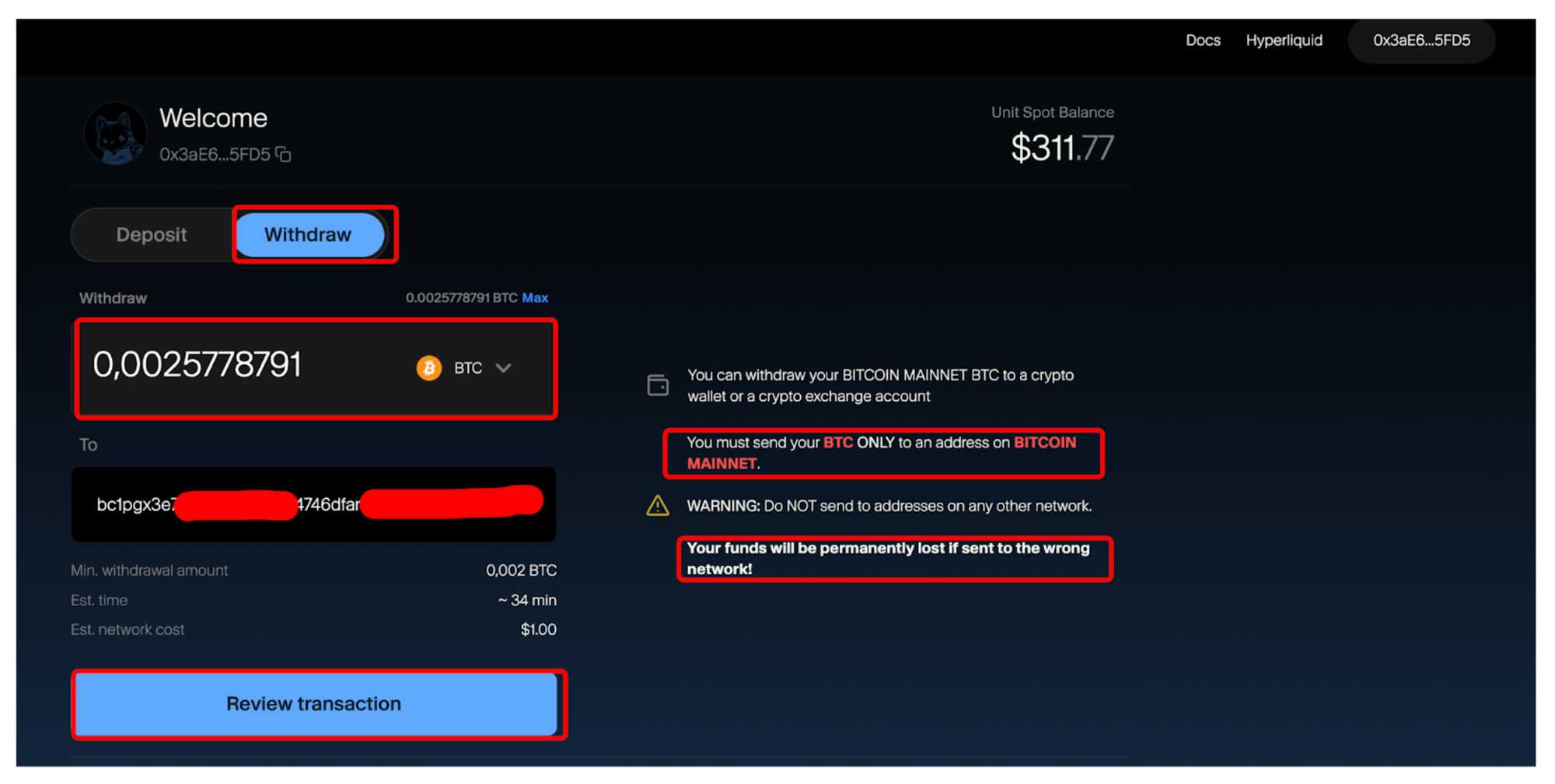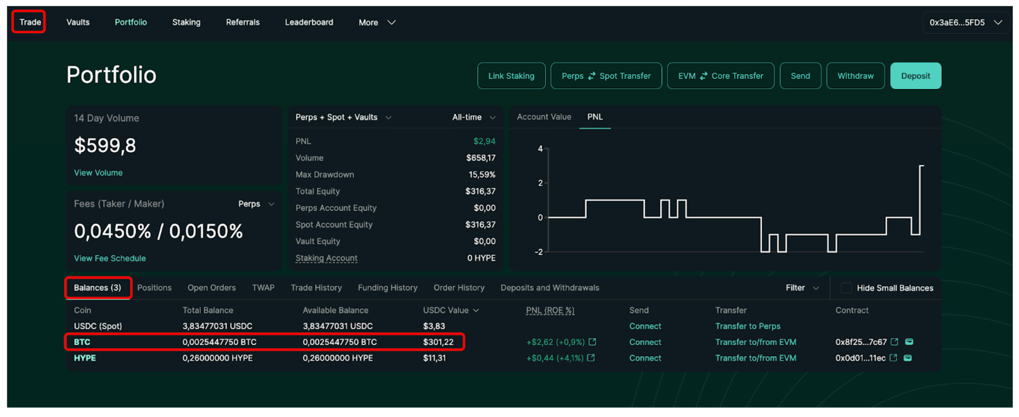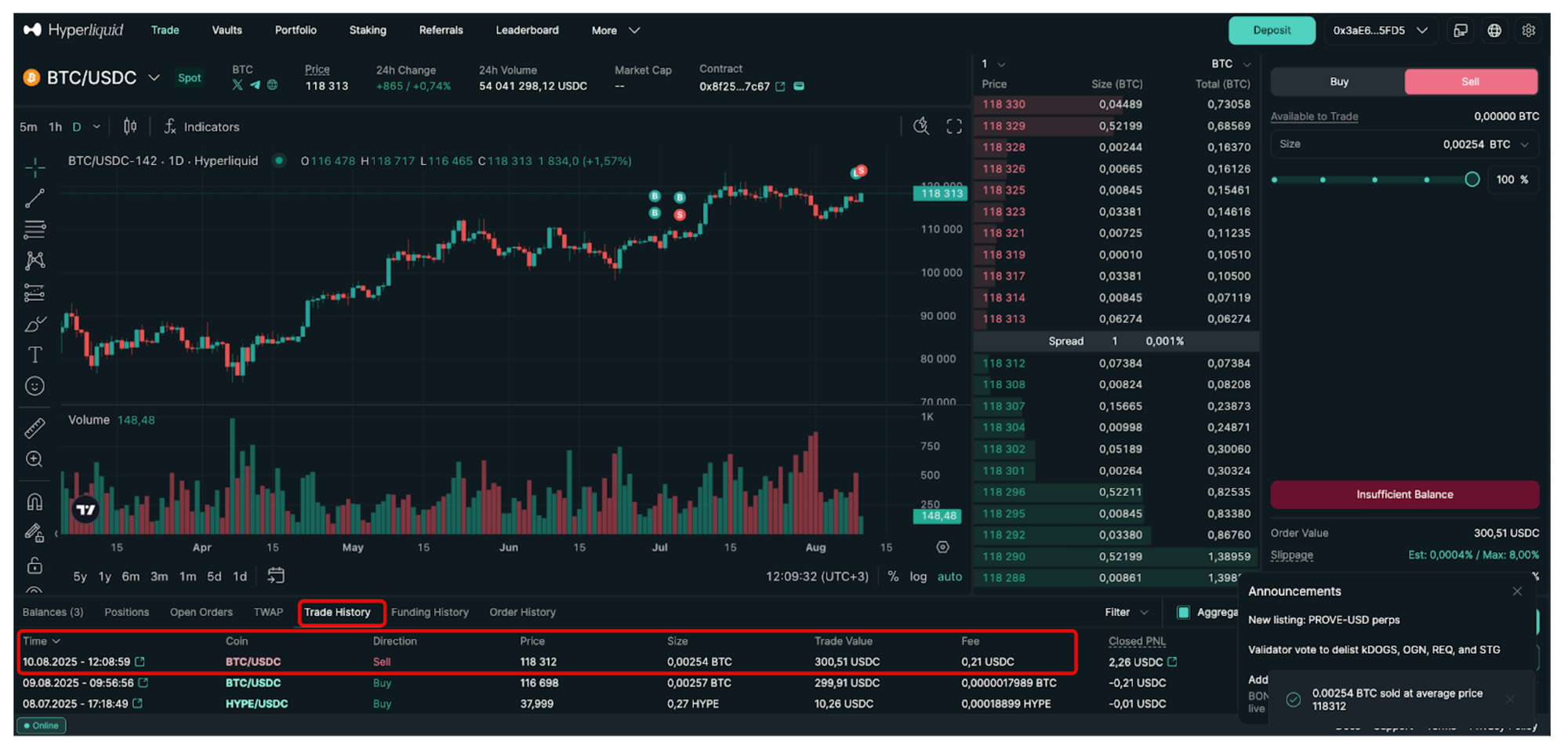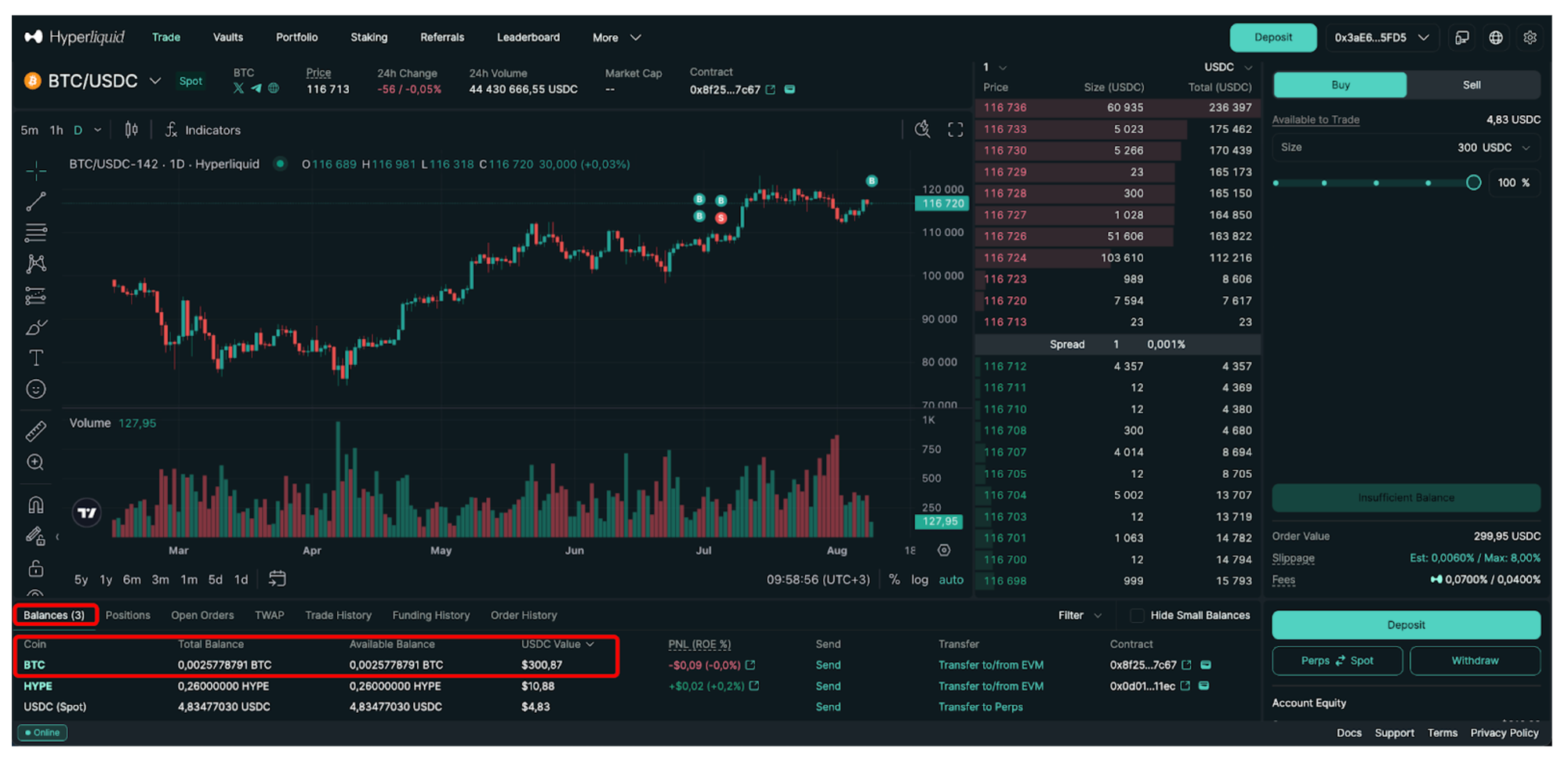 - Мы можем перевести BTC из Hyperliquid в нативной сети на свой Биткоин кошелек. BTC мы предварительно купим на DEX бирже Hyperliquid.