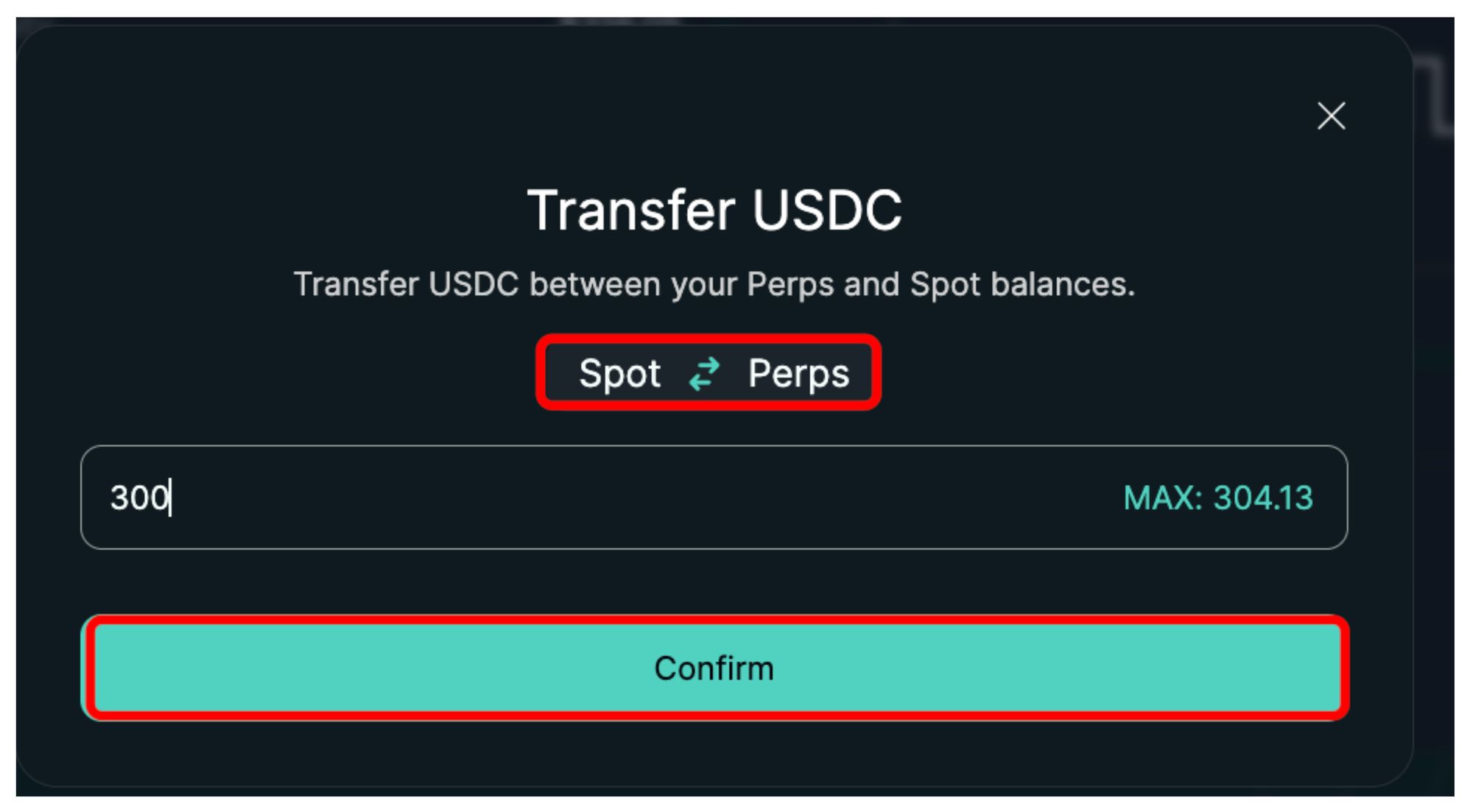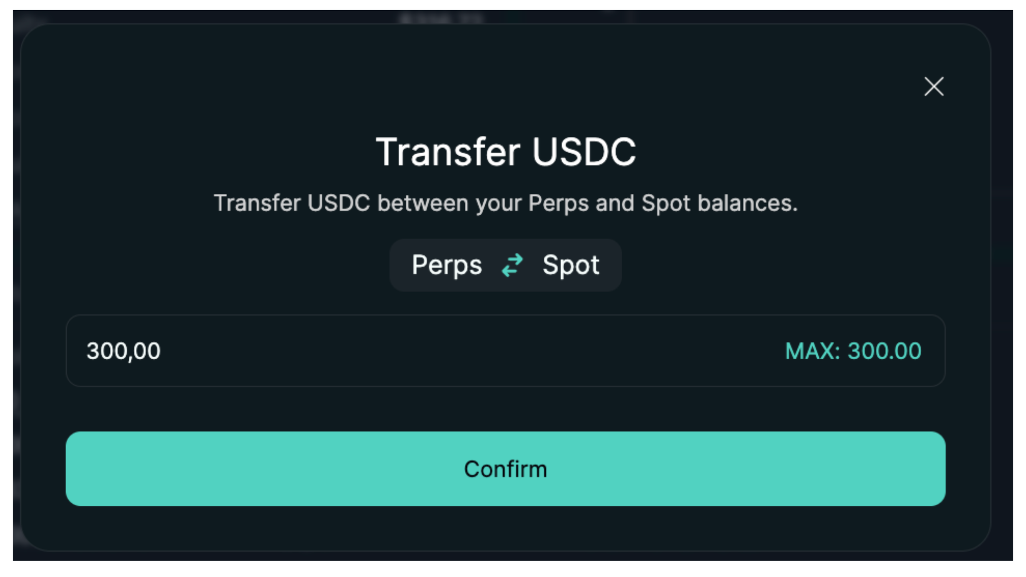 - Нажимаем кнопку Transfer to Perps. Вводим необходимое количество USDC. Подтверждаем перевод. Подписываем транзакцию в кошельке.