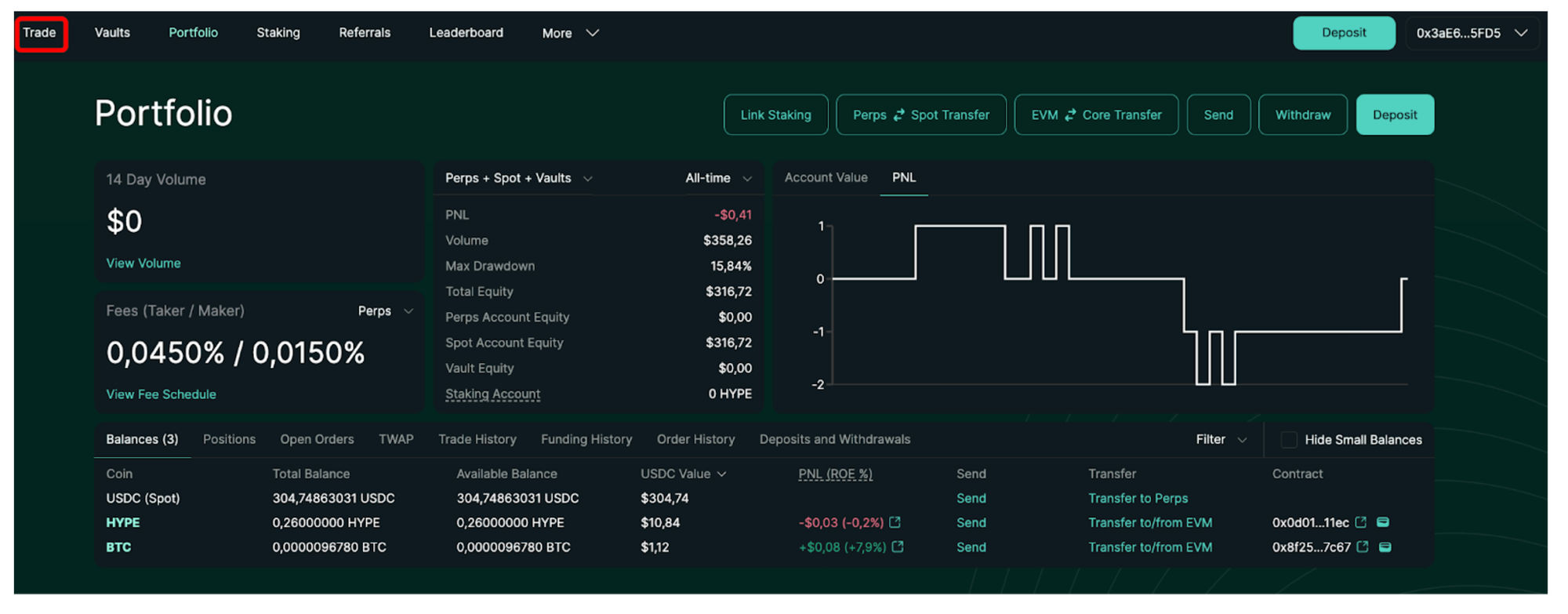 - Подключаемся к Hyperliquid по ссылке https://app.hyperliquid.xyz/trade, или лучше по ссылке, полученной в Defillama. Подключаем кошелек, в нашем примере Rabby Wallet, тот же адрес, который мы подключали к HyperUnit. Раздел Portfolio, вкладка Balances, мы видим BTC, который отправили из кошелька в Hyperliquid через мост HyperUnit.