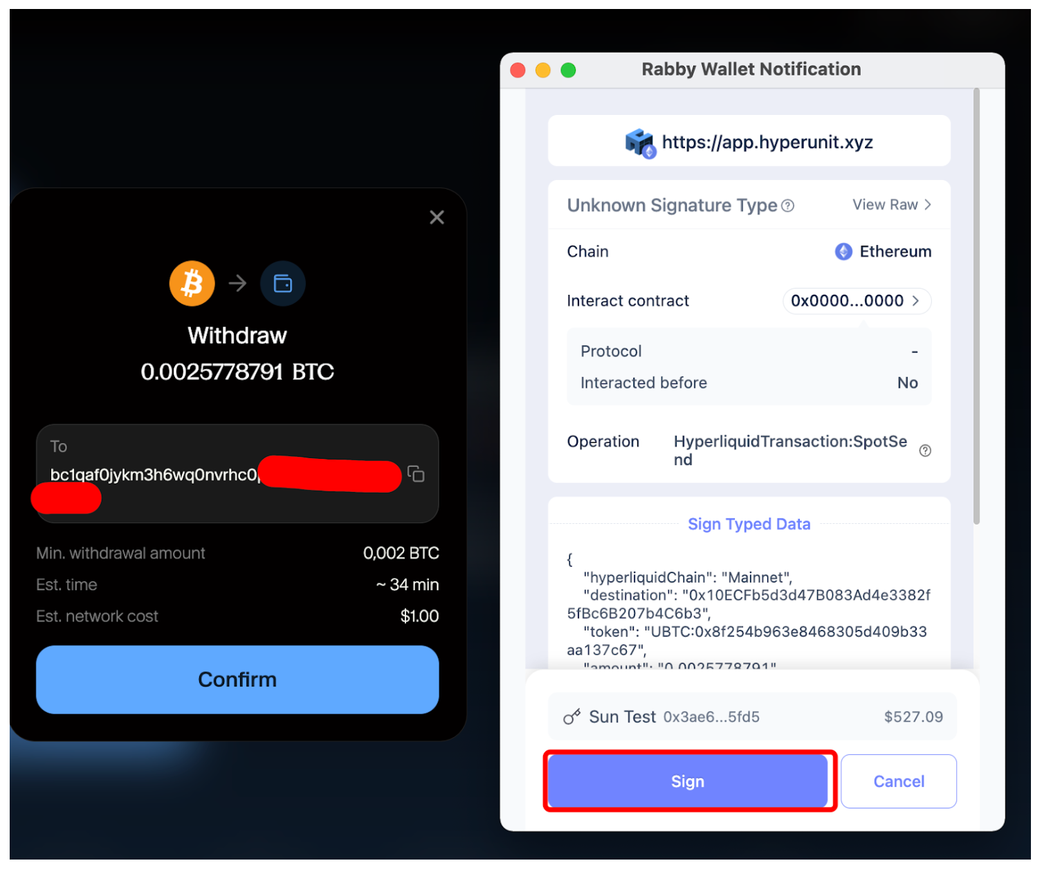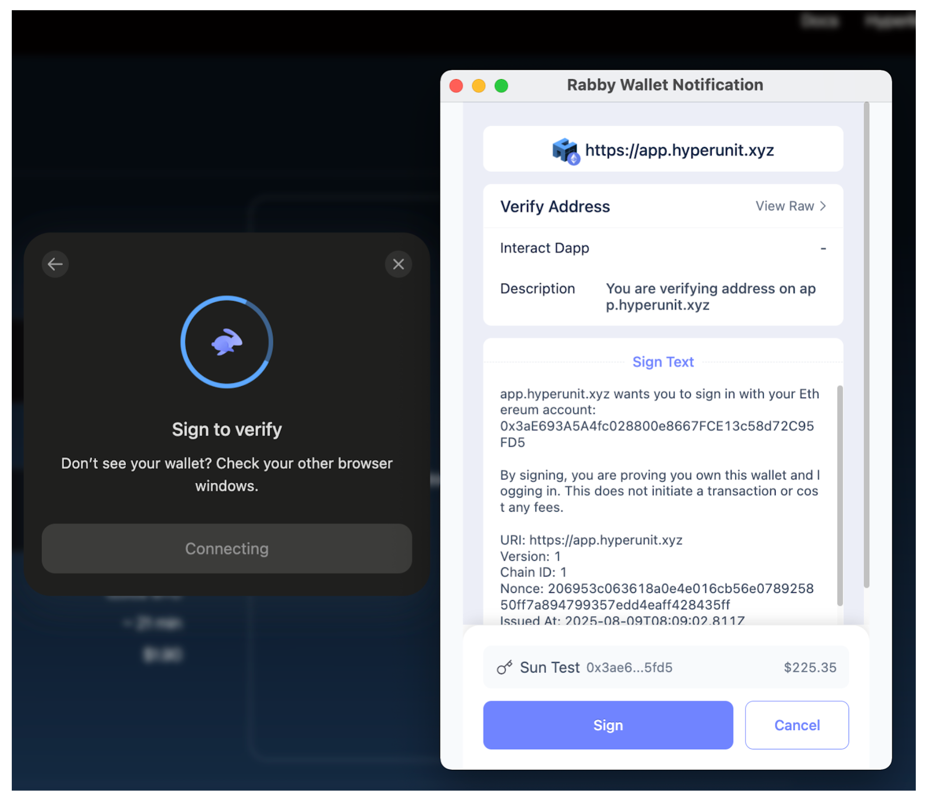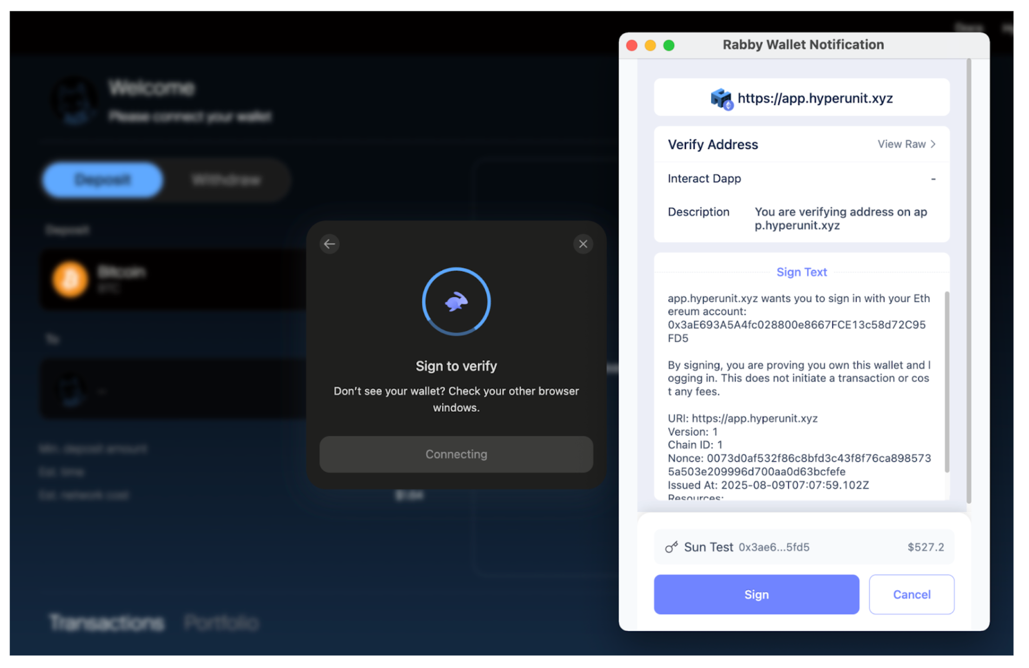 - Подключаемся к HyperUnit по ссылке https://app.hyperunit.xyz/, или лучше по ссылке, полученной в Defillama. Подключаем кошелек, в нашем примере Rabby Wallet. Нам нужно подключить адрес, который мы используем для биржи Hyperliquid. Мост подключается к нашему балансу на Hyperliquid. Подписываем транзакцию.