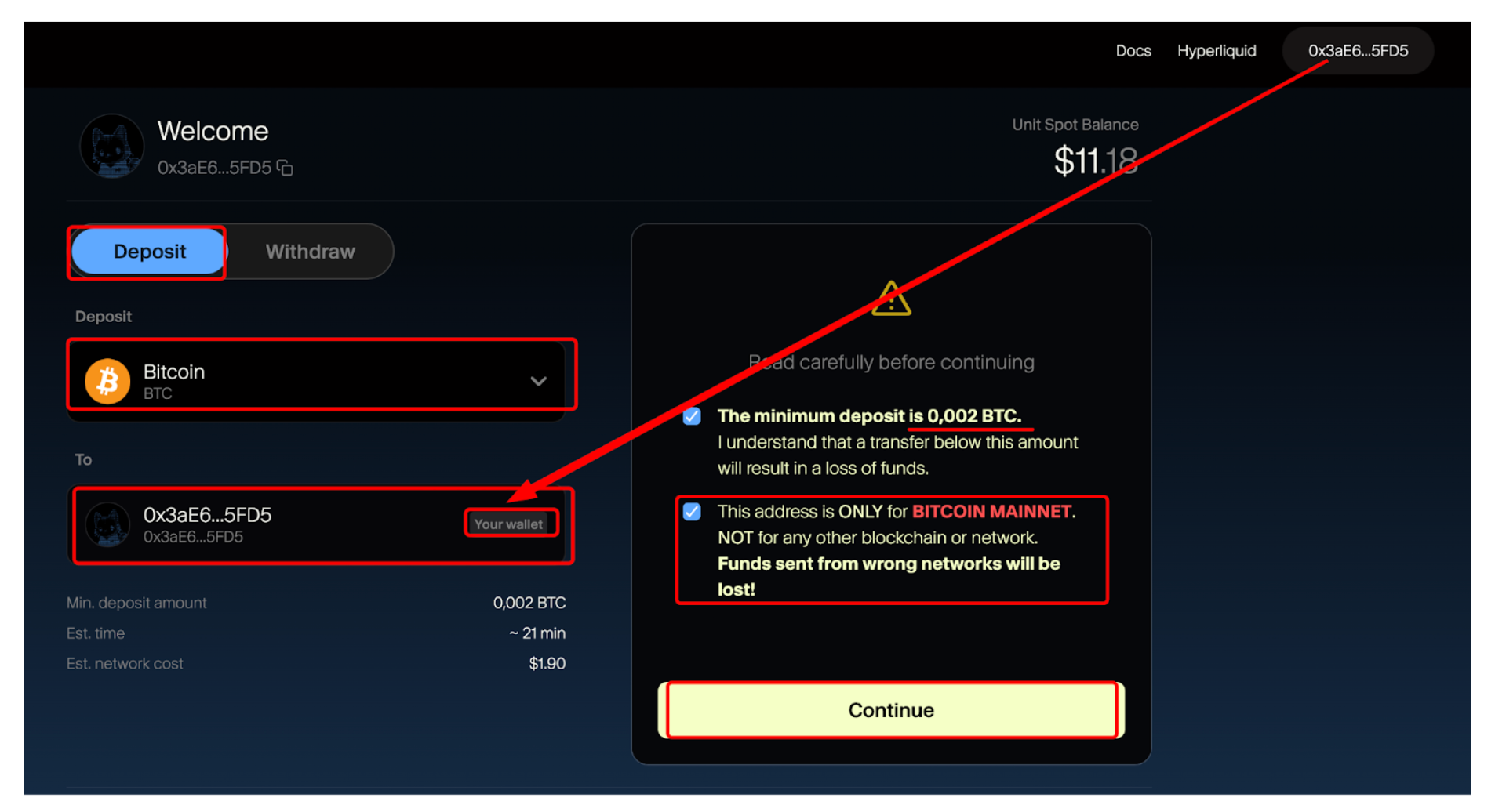 - Проверяем, что в поле “To” скопировался адрес кошелька, который мы используем для биржи Hyperliquid. Внимательно читаем все предупреждения. Минимальное кол-во биткоинов для перевода 0,002 BTC. Адрес, который нам выдаст Мост - только для пополнения BTC в нативной сети.