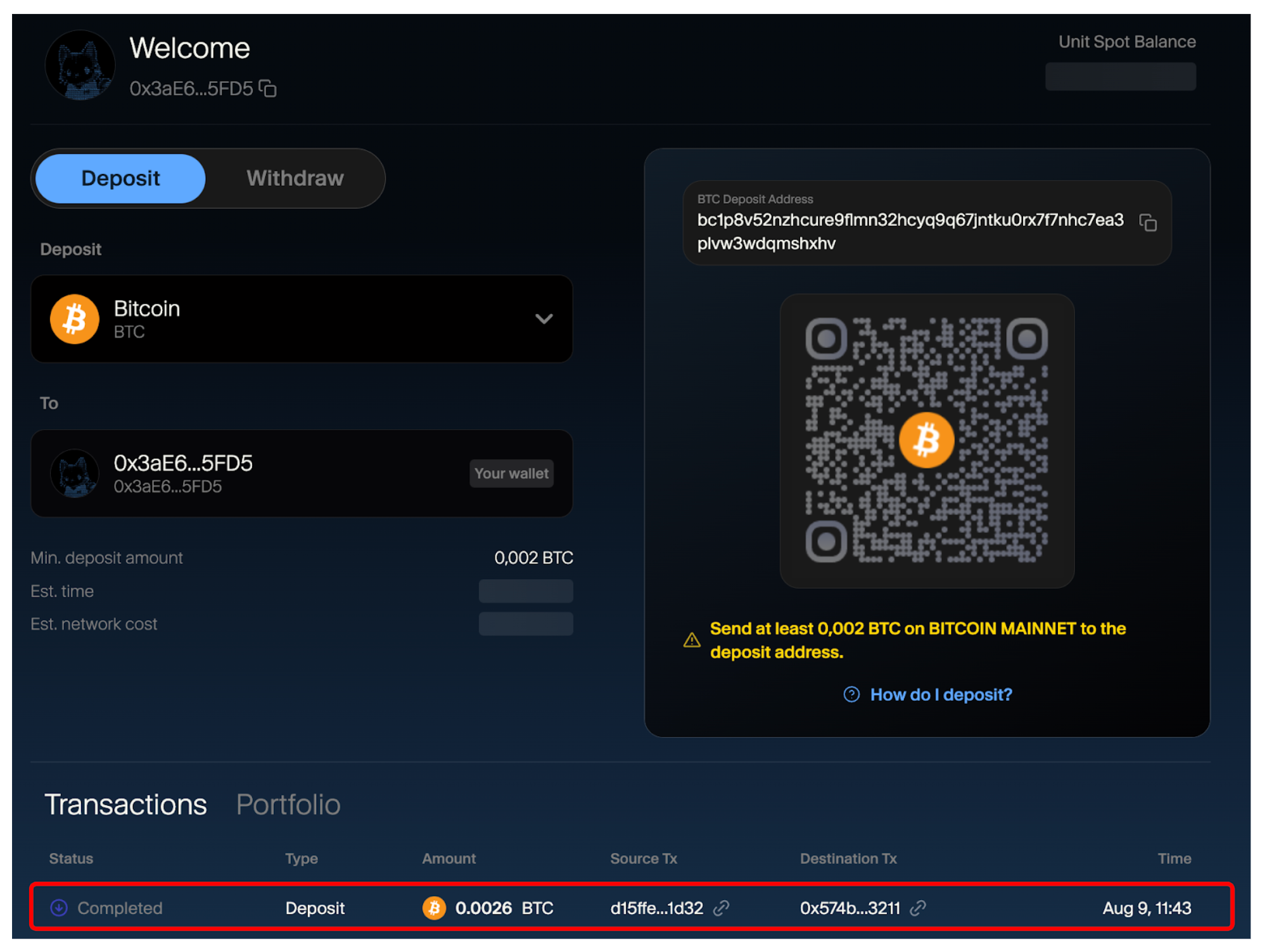 - Во время подтверждения транзакции блокчейном можно видеть ее статус и количество переводимых BTC в мосте HyperUnit во вкладке Transactions.