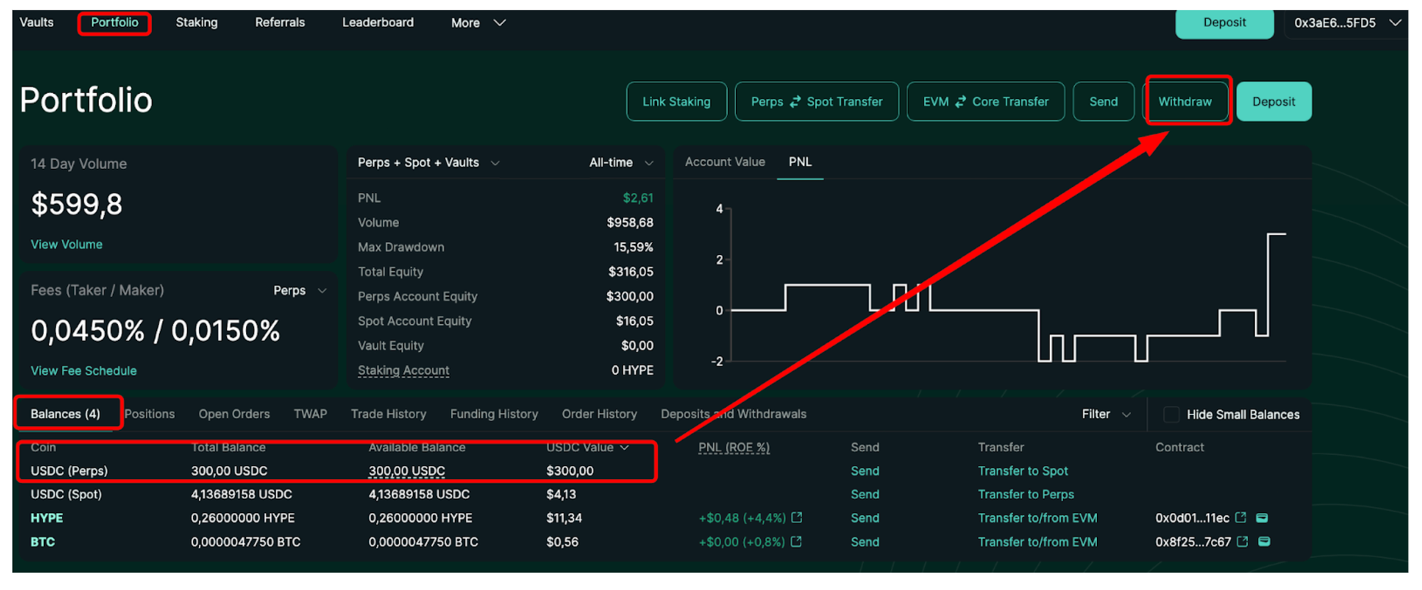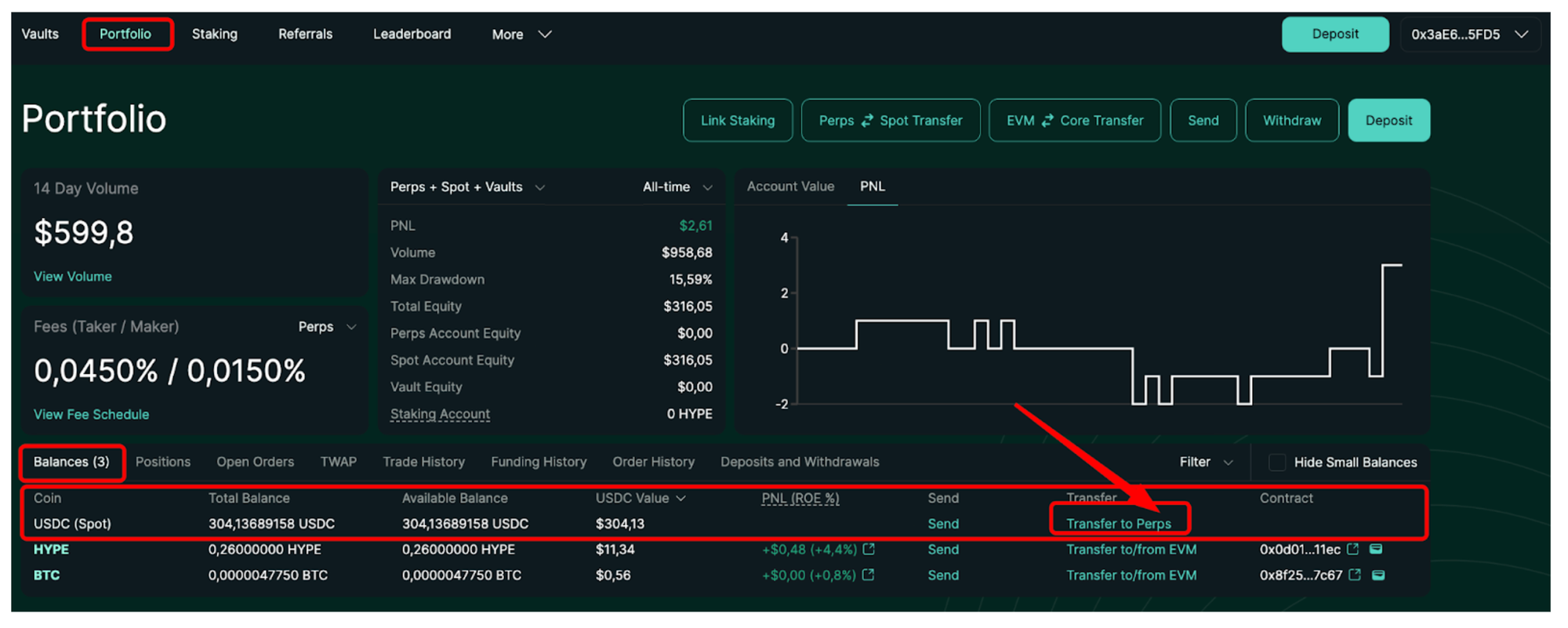 - Переходим во вкладку Portfolio. Для перевода USDC на свой EVM кошелек нам нужно поменять статус USDC cо Spot на Perps.