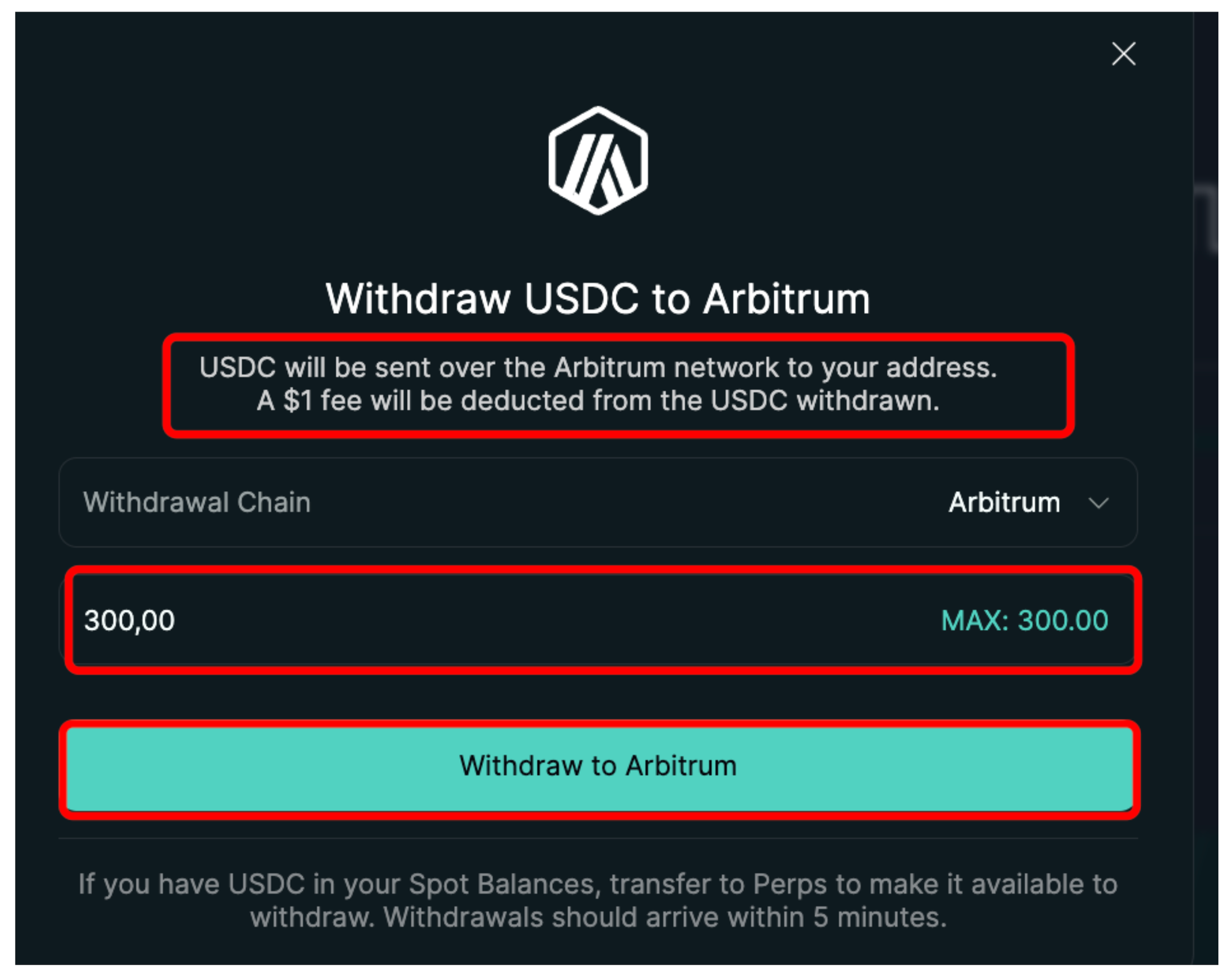 - Для вывода USDC на свой EVM кошелек нажимаем Withdraw. Указываем необходимое количество USDC. Внимательно читаем все предупреждения. Комиссия за операцию $1. Если на балансе USDC Perps не будет свободных долларов, то сумма перевода уменьшится на $1.