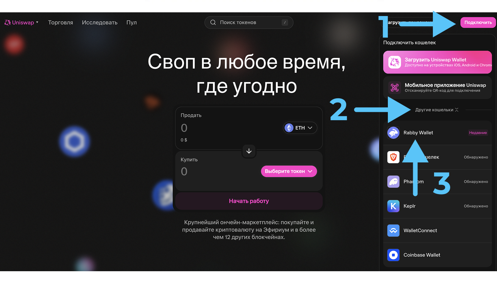 - Кликаем на “Подключить” (1), нажимаем на “Другие кошельки” (2) и выбираем Rabby Wallet (3)
