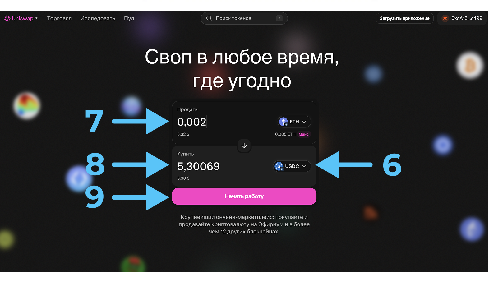 - Заполняем сумму, которую хотим потратить (7) и проверяем, сколько получим средств во втором токене при обмене (8)
