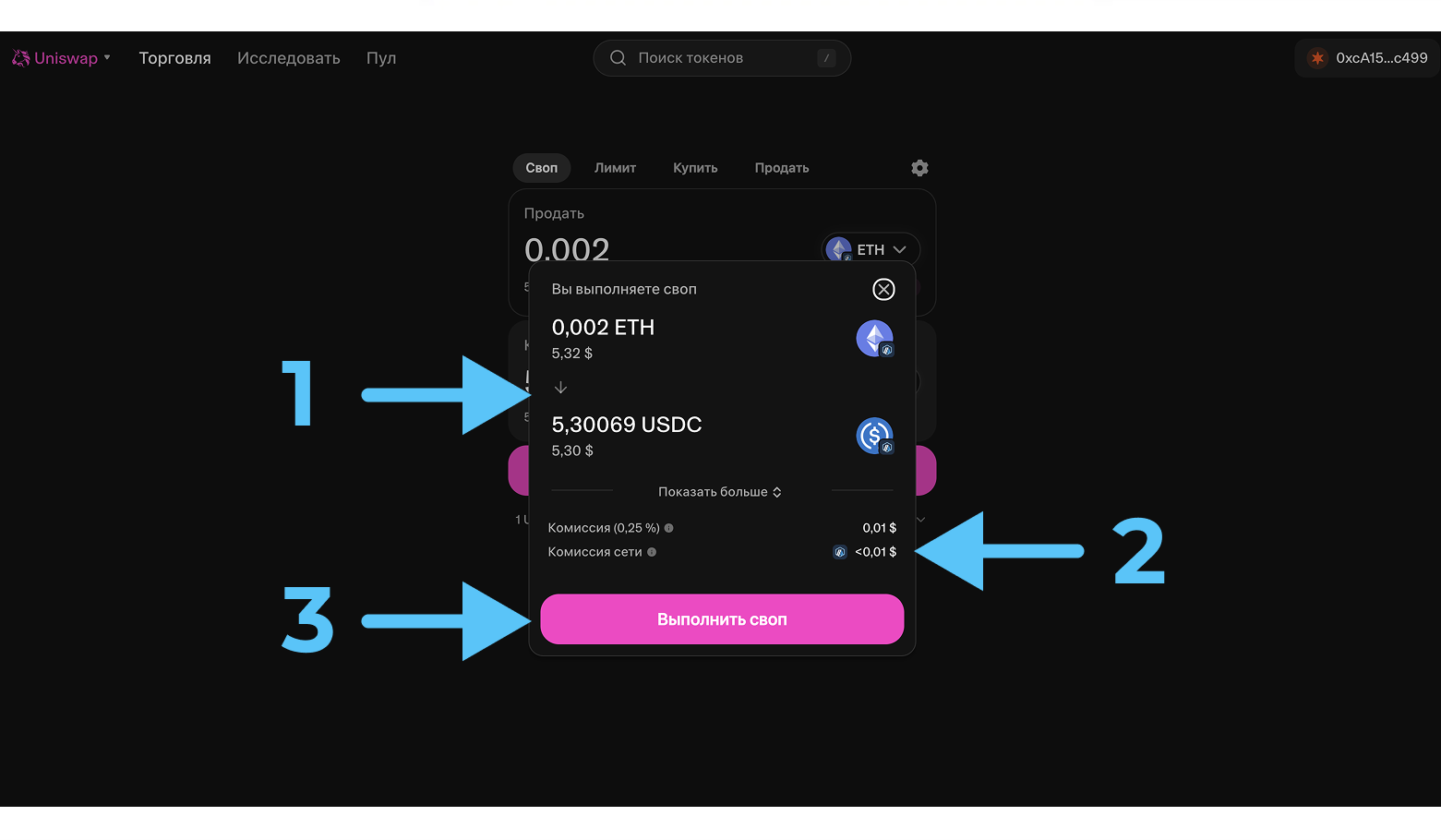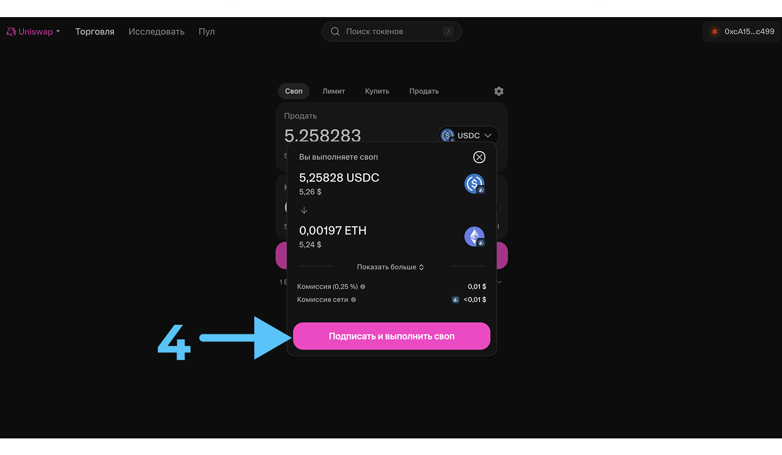 - Кликаем на “Выполнить своп” (3) и подписываем транзакции (4)