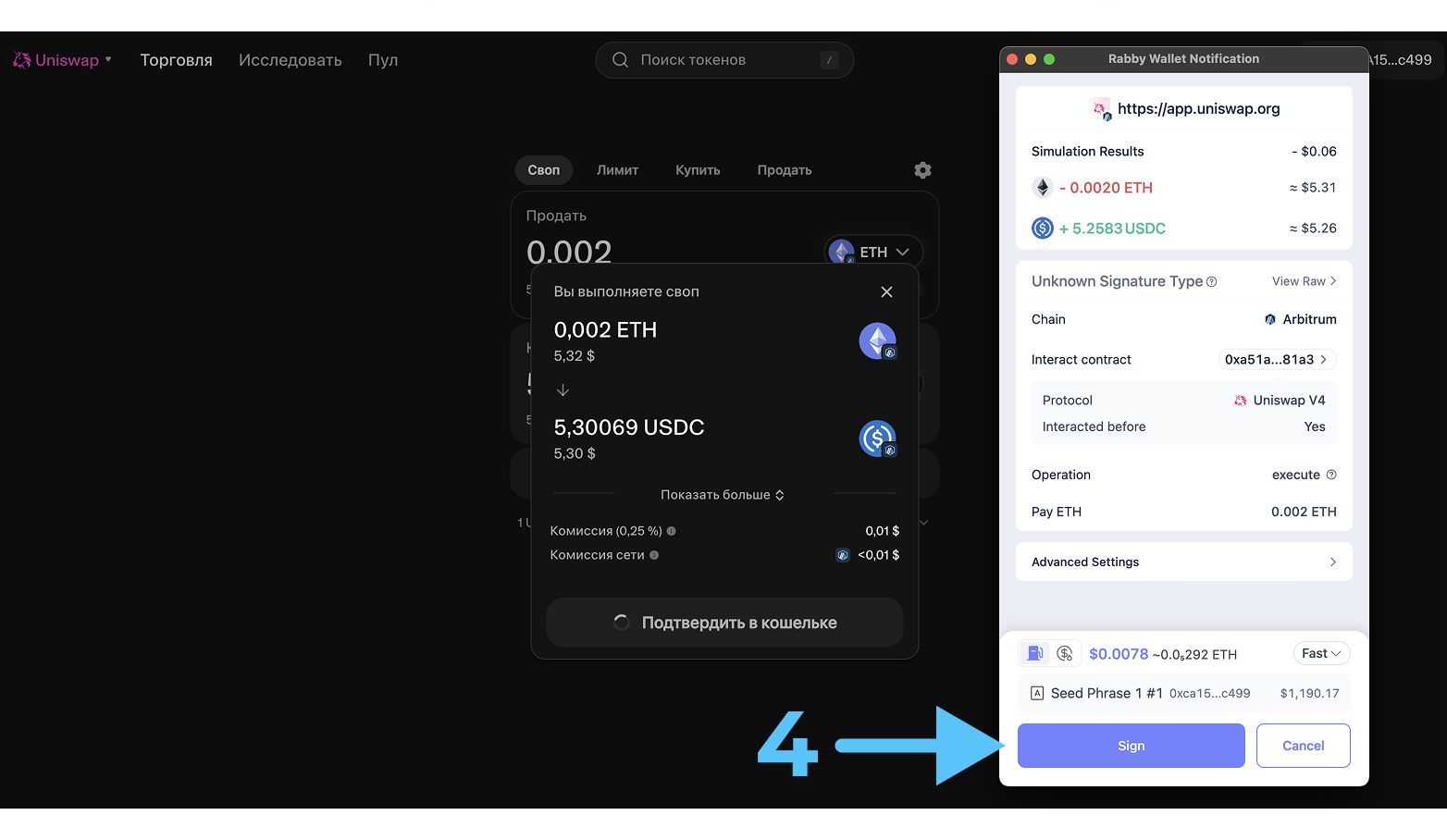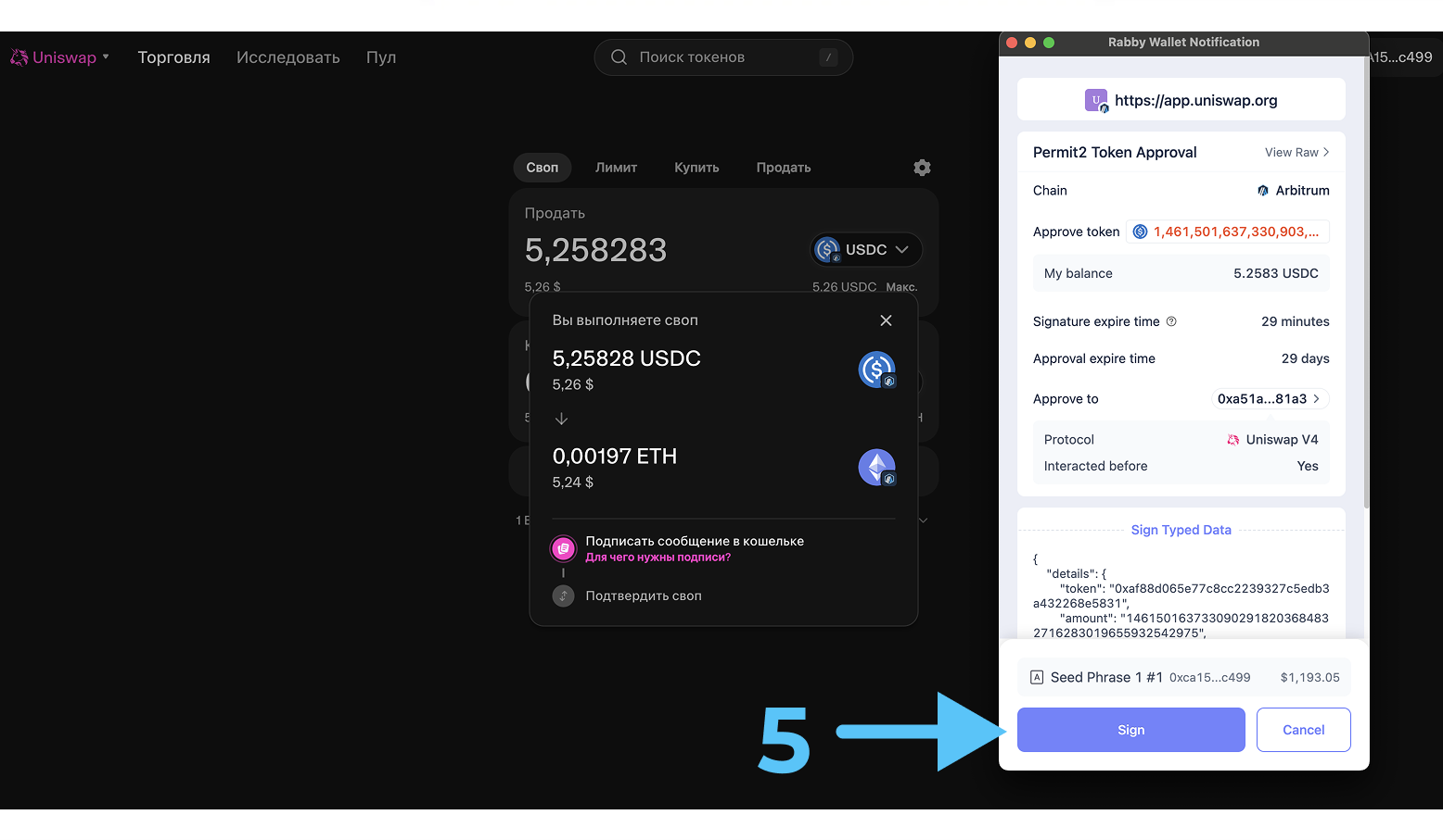 - Еще раз перепроверяем данные и кликаем на “Подписать и выполнить своп” (4). Затем подписываем транзакции (5)
