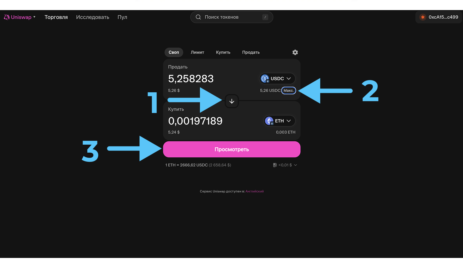 - Либо вводим все данные по аналогии вручную, либо нажимаем на стрелочки (1), кликаем на “Макс” (2) - если хотим обменять все монеты. Перепроверяем данные и смотрим на комиссию. Затем кликаем на “Просмотреть” (3)