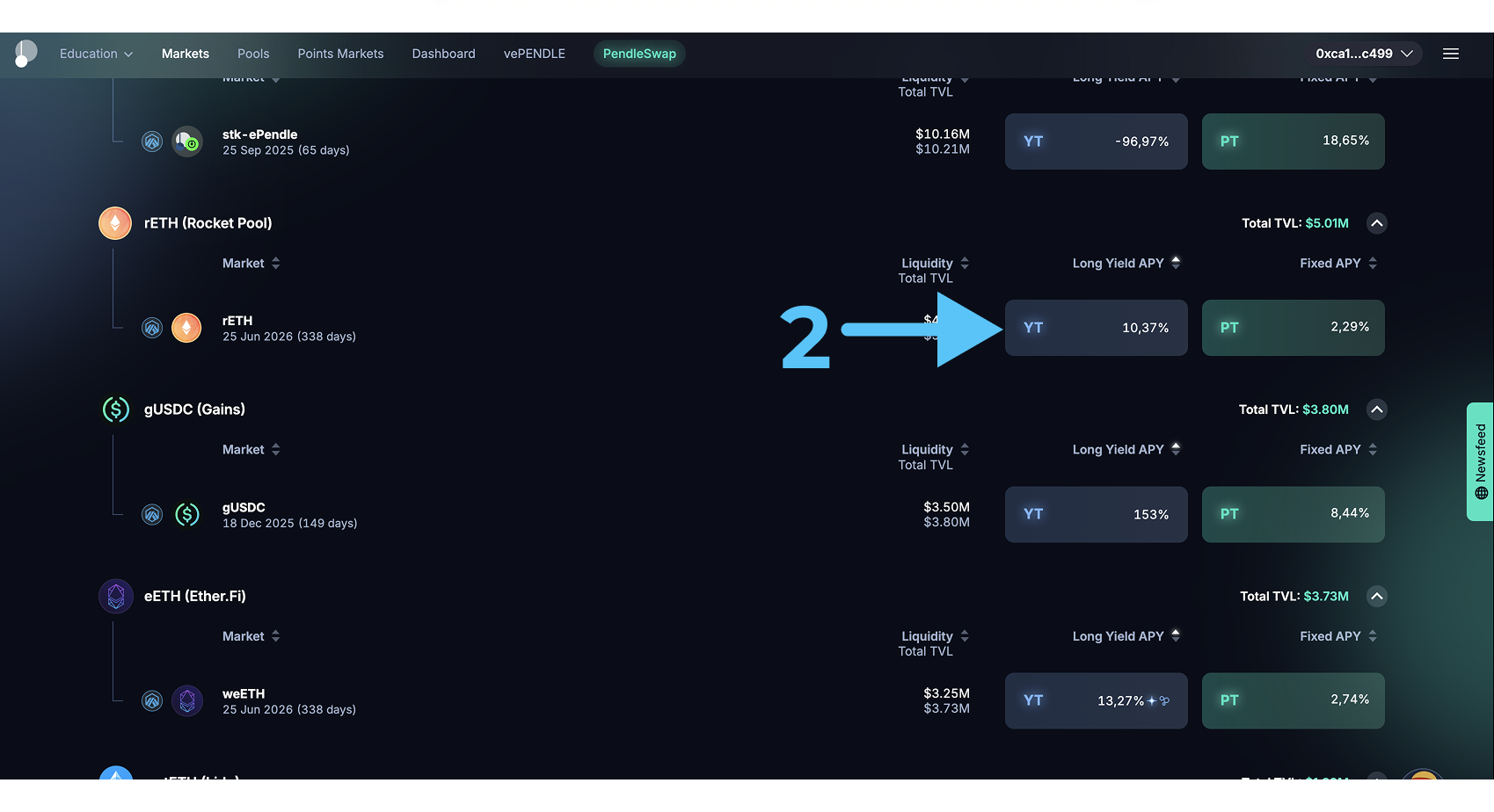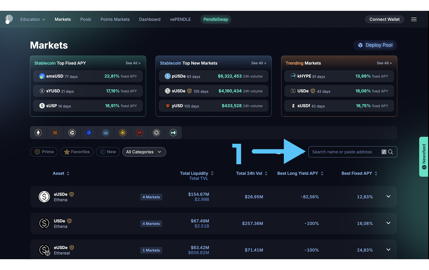 - На этой же странице в Pendle мы можем найти интересующий нас актив через поиск (1).
