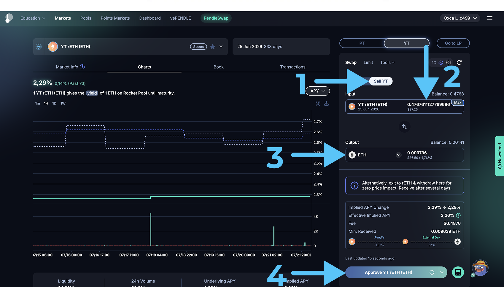 - Далее выбираем актив на который мы хотим обменять наш YT (3), кликаем на "Approve YT..." (4) и подписываем транзакцию в кошельке.