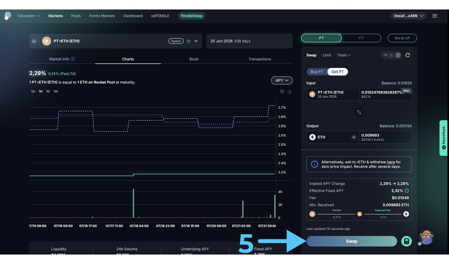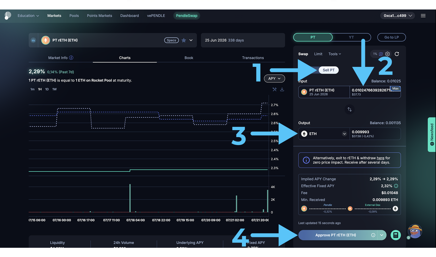 - Если мы хотим купить PT, мы можем проделать аналогичные действия, которые описаны в шаге 2, только выбрав опцию "PT" (через общее меню Pendle). Если же мы хотим купить PT для того же актива, что и YT, то нам нужно выбрать соответствующую опцию (1).