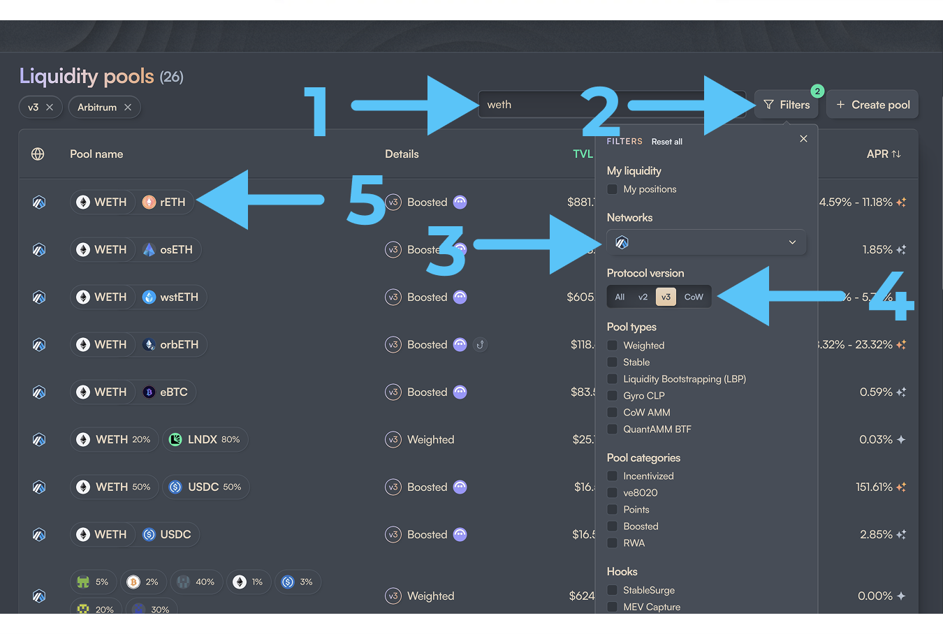 - Выбираем нужную сеть (3) и версию пула (4), которая нас интересует. Можно также поиграться с настройками фильтра