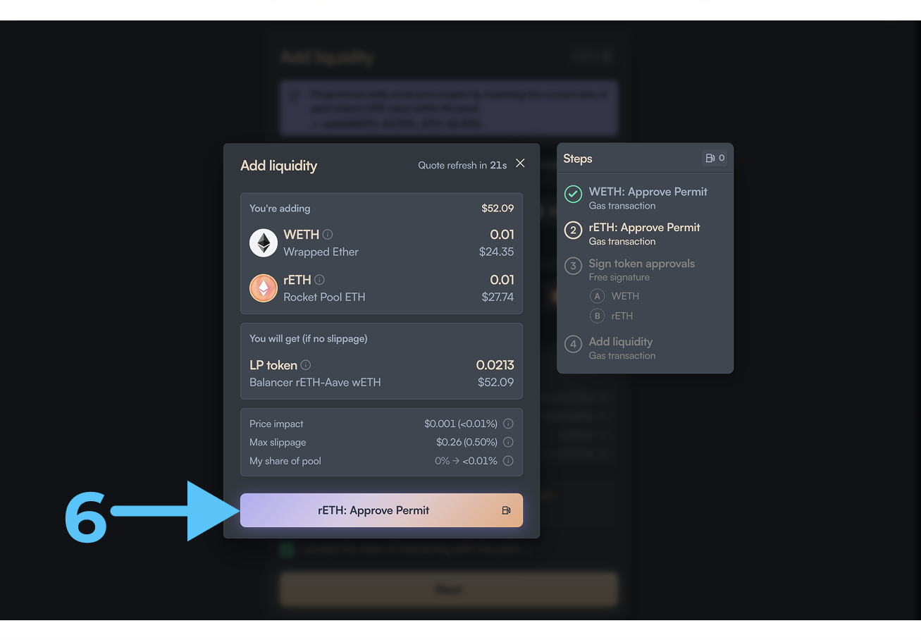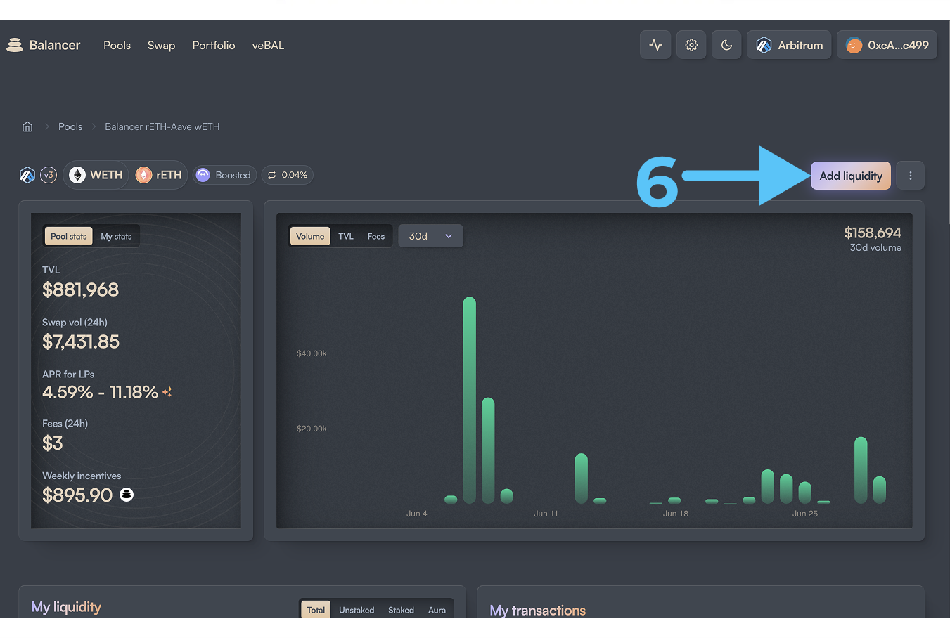 - Кликаем на нужный нам пул (5), во сплывшем окне нажимаем на “Add liquidity“ (6)