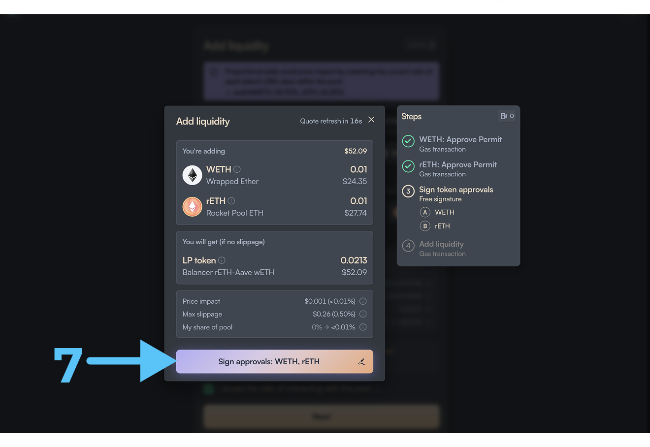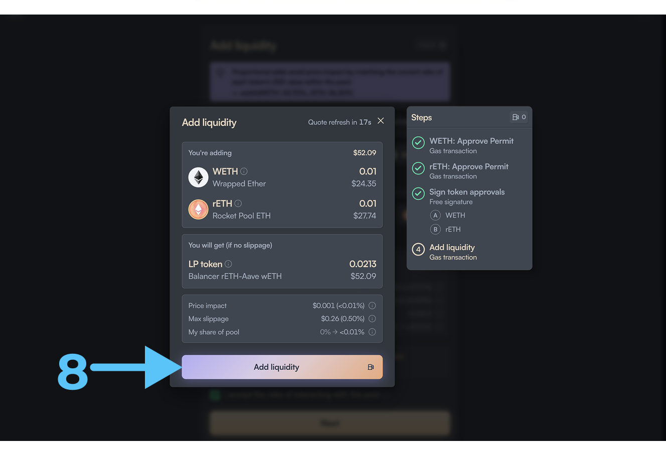 - Кликаем на (6), подписываем транзакцию в кошельке, затем кликаем на (7) и подписываем транзакцию и наконец кликаем на (8) и подписываем транзакцию