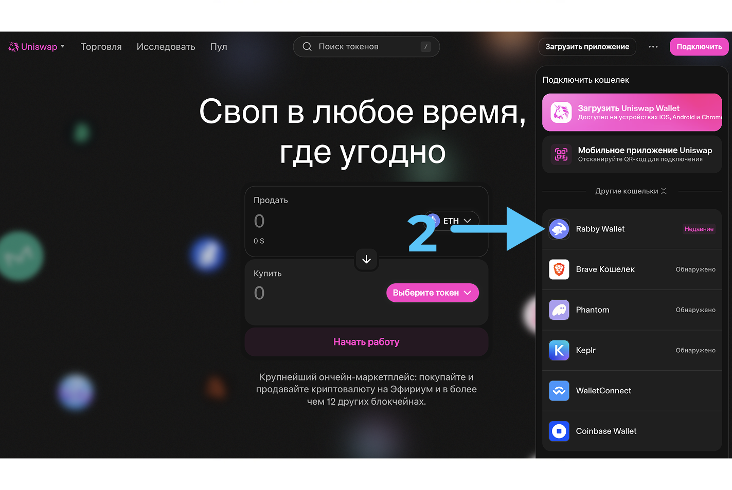 - Кликаем на “Подключить” (1) и выбираем Rabby Wallet (2)