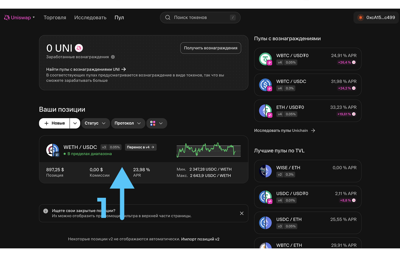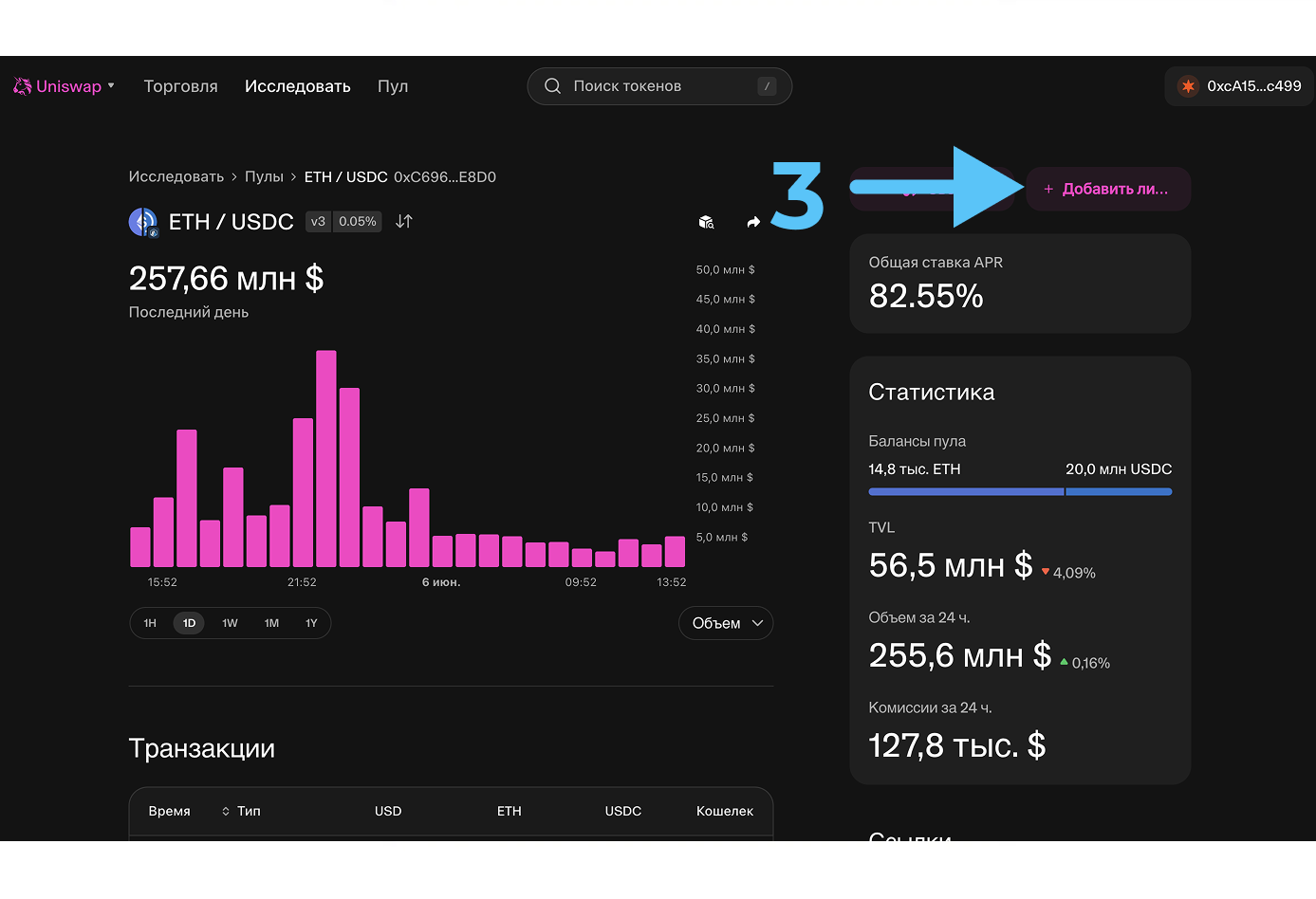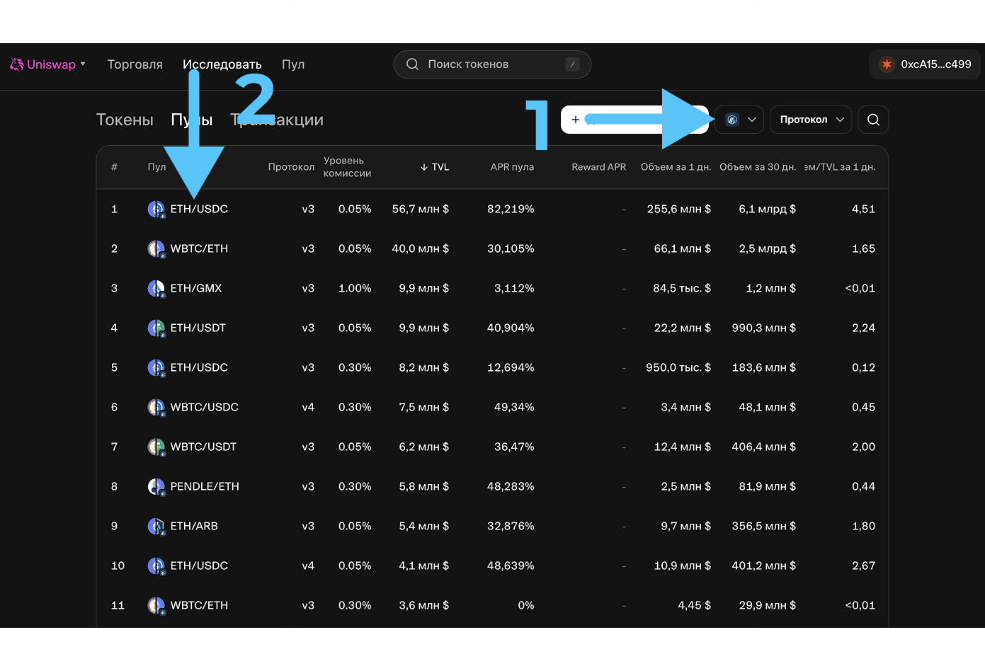 - Выбираем пул, который нам интересен (2) - в нашем случае это ETH/USDC