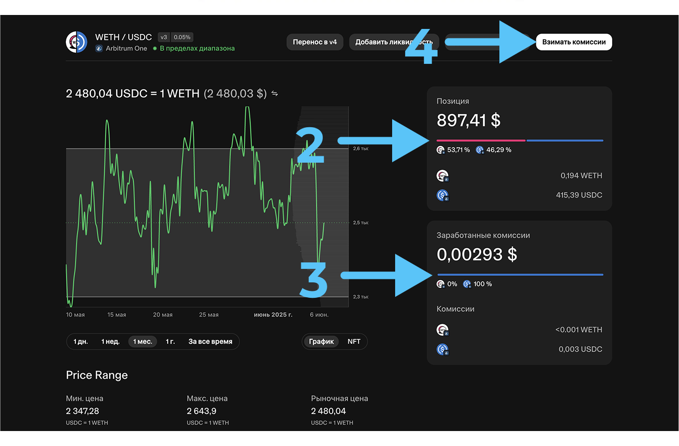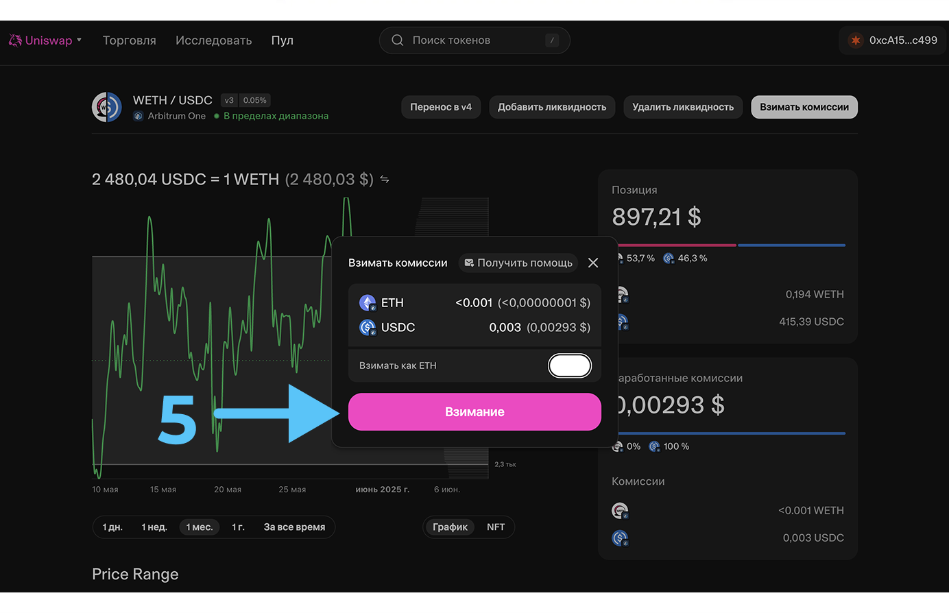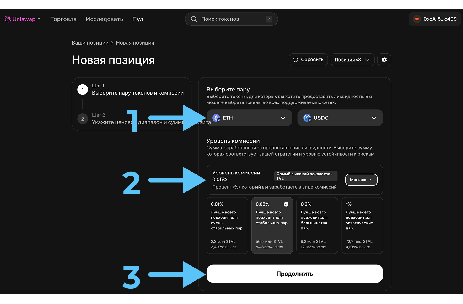 - Выбираем пул, который нам интересен (2) - в нашем случае это ETH/USDC