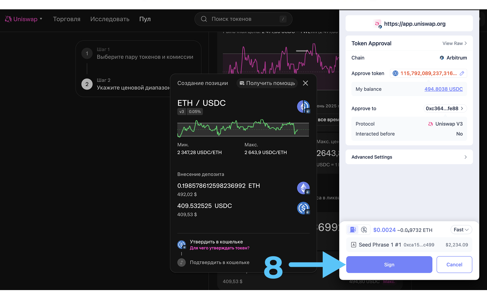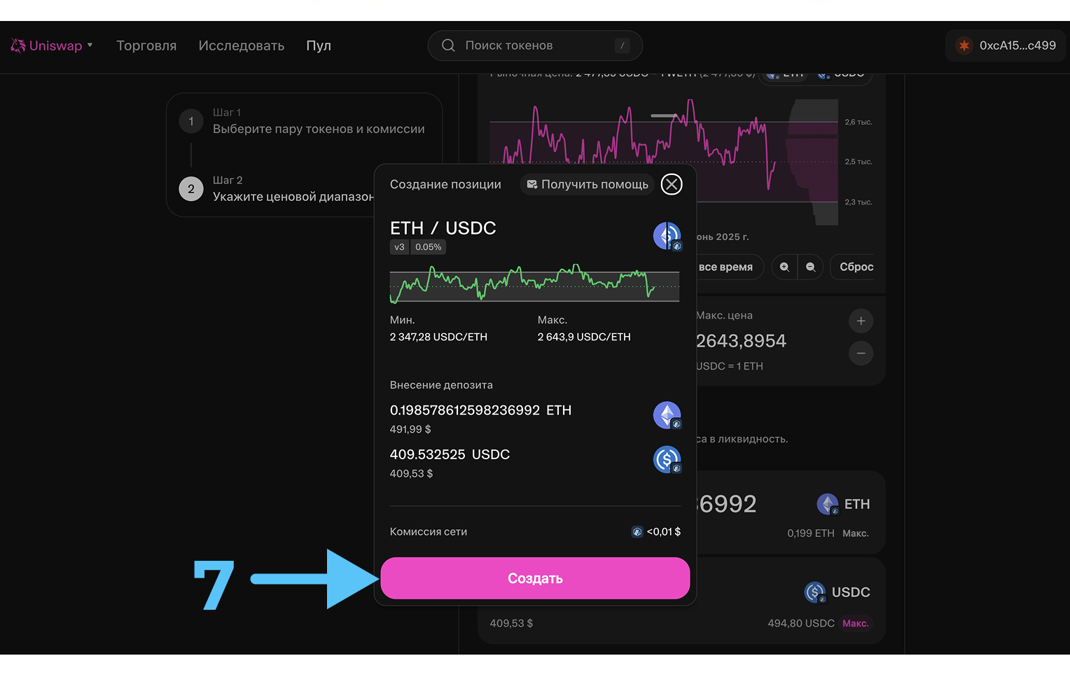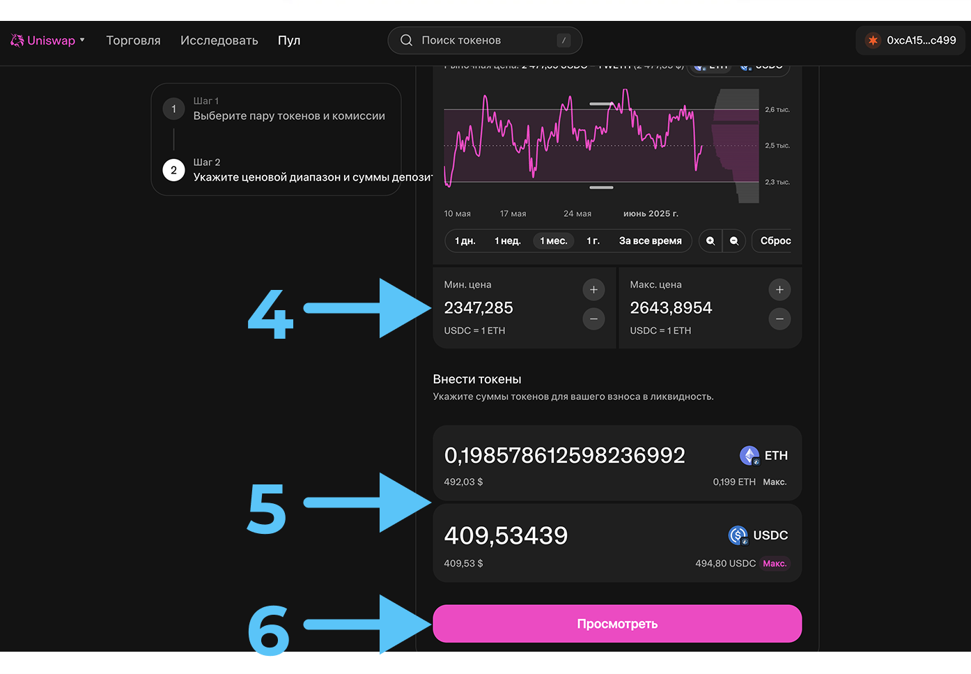 - Вводим минимальный и максимальный диапазон (4), указываем количество ETH и USDT, которое хотим внести в пул (5).