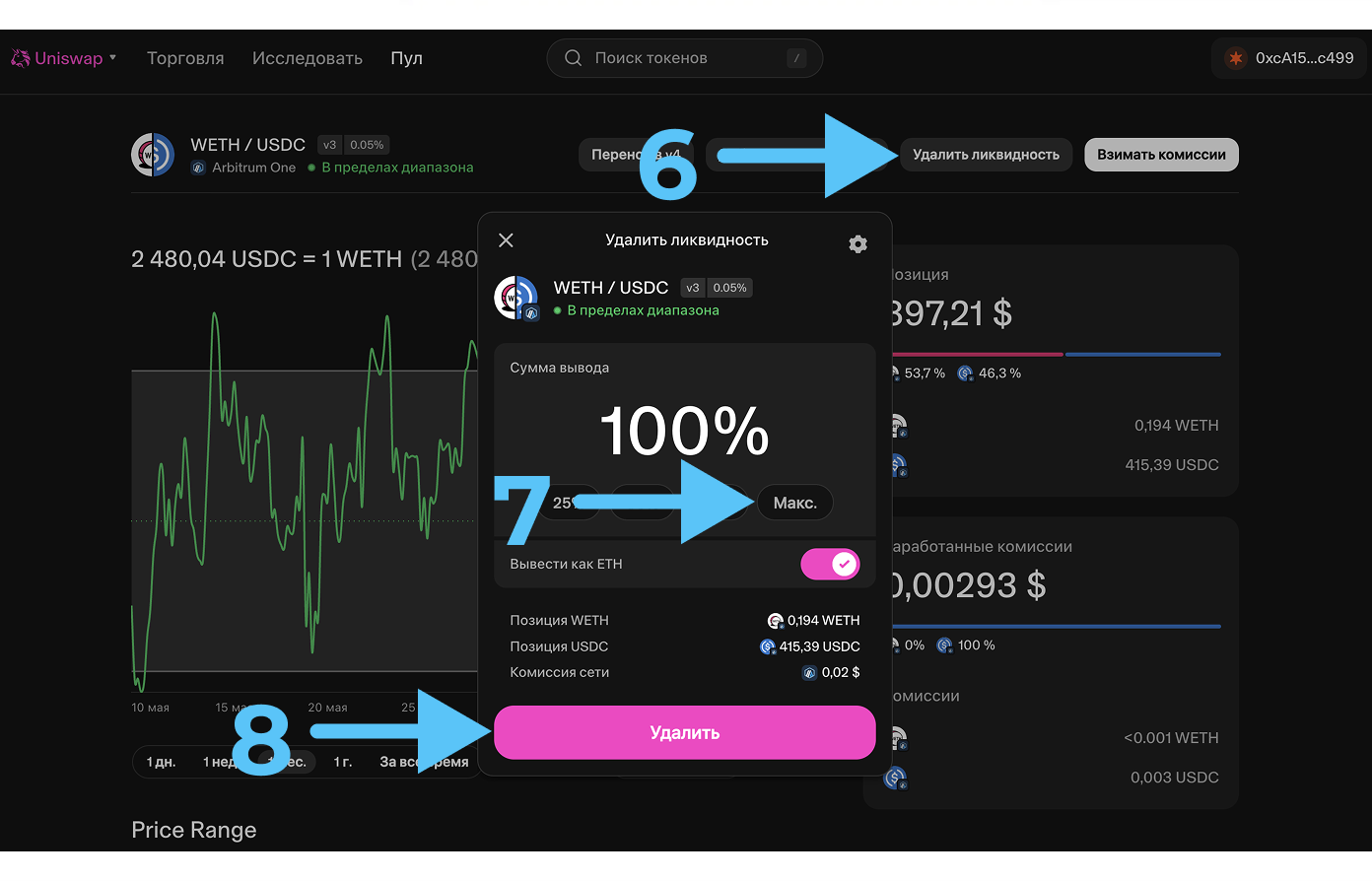 - Чтобы закрыть нашу позицию, нужно кликнуть на “Удалить ликвидность“ (6), выбираем все средства “Макс.” (7), далее кликаем на “Удалить” (8). Сейчас мы не будем закрывать нашу позицию, т.к. пока что наша стратегия не достигла поставленных целей.